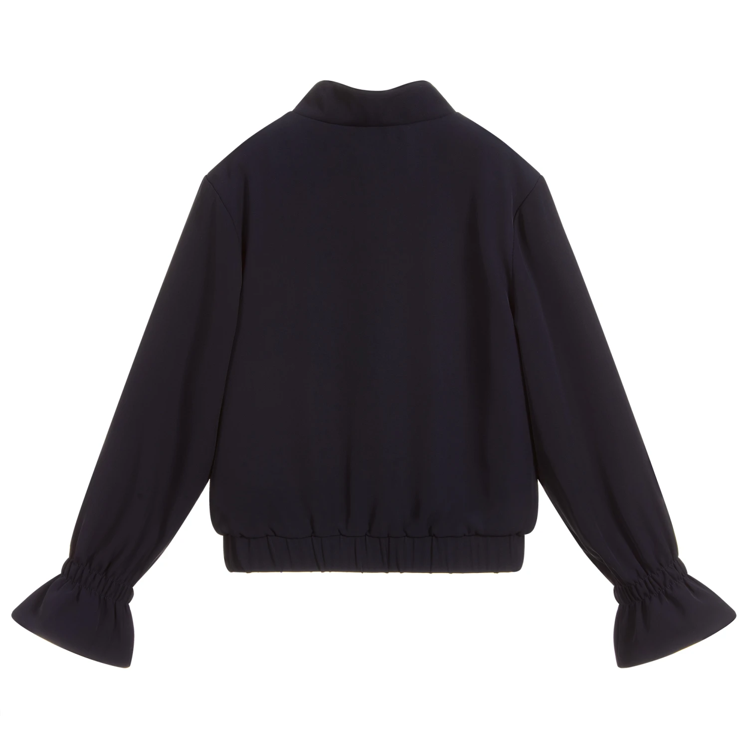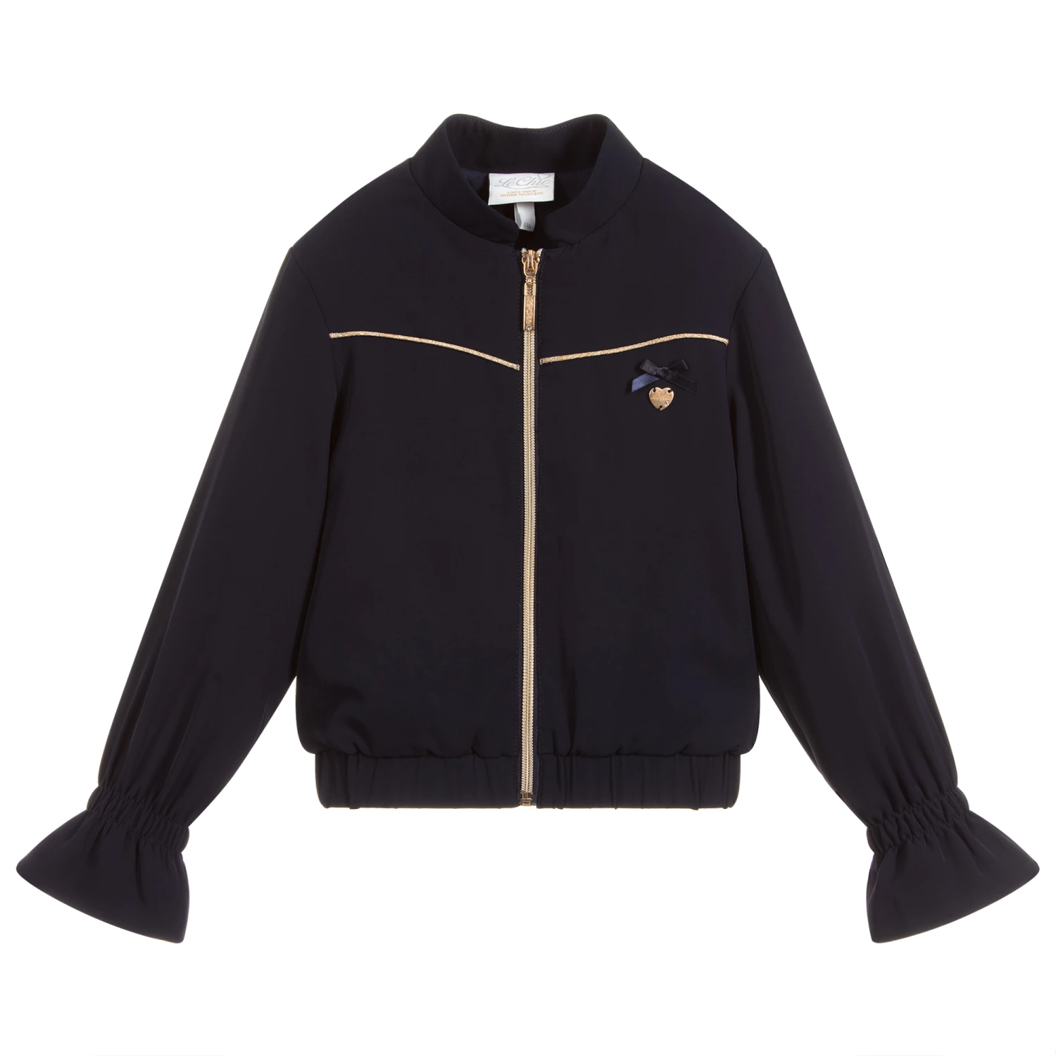 Le Chic’s navy blue zip-up top for girls, is made in mid-weight crêpe and lined in lightweight jersey. It has a stand-up collar, sparkly gold piping on the chest and a gold logo tab with a satin bow. With a comfortable elasticated waistband and ruffled cuffs, it has a gold zip fastening on the front.