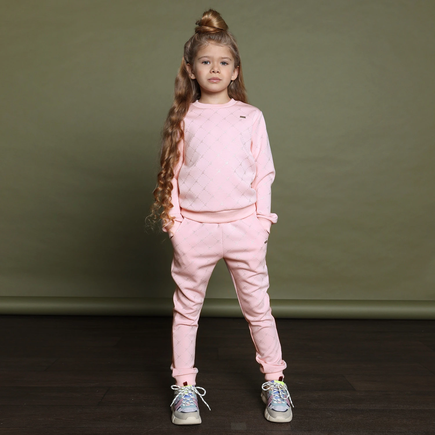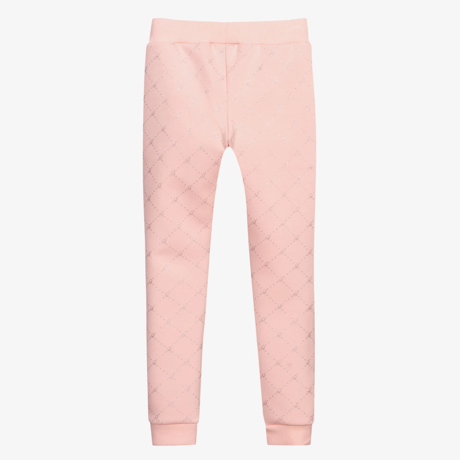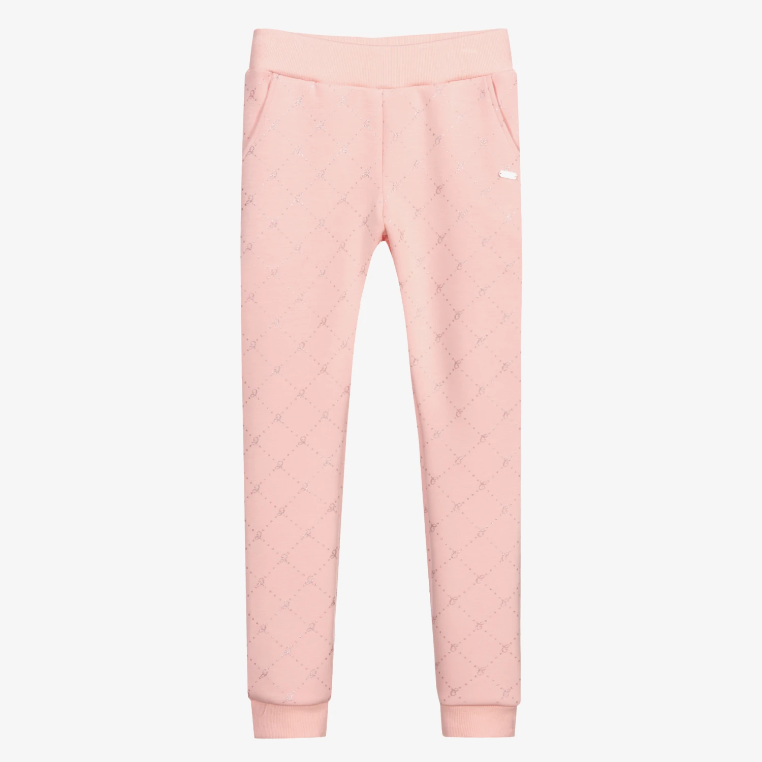 Girls pink joggers from Le Chic, made in soft and stretchy polycotton jersey. They have a glittery silver diamond logo pattern and a pink logo plaque on the front. The waistband and cuffs are ribbed, and there are two front pockets.