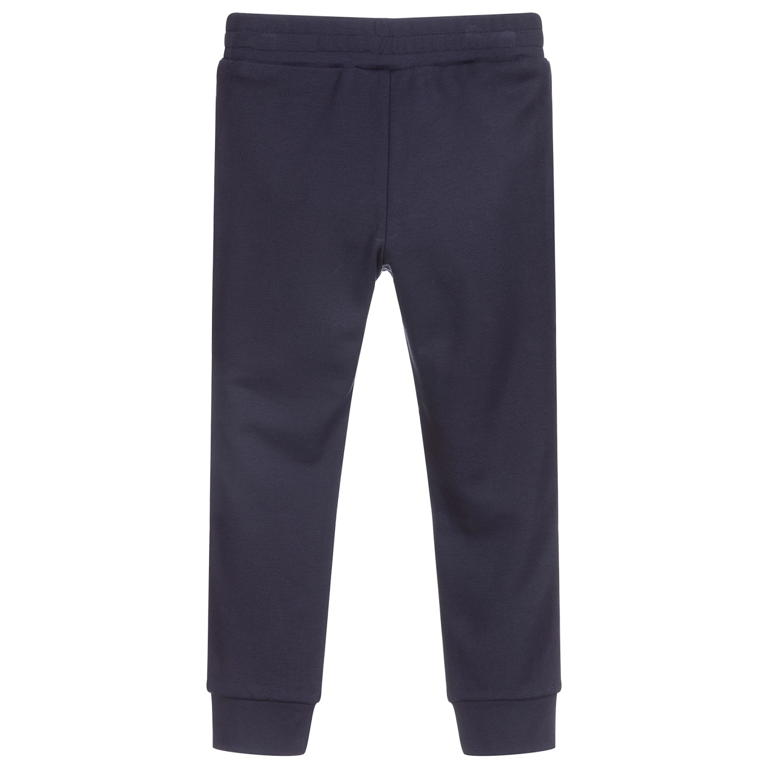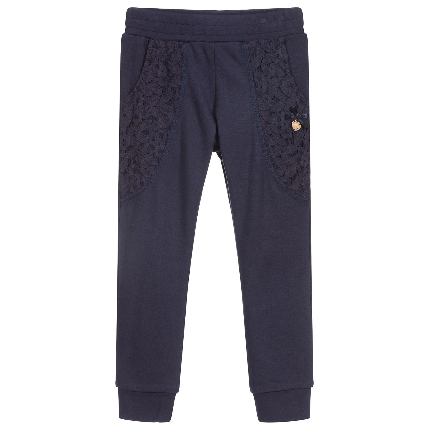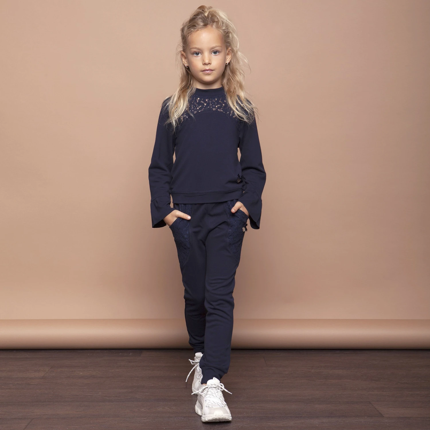 Girl’s navy blue jersey joggers by Le Chic. Soft and stretchy, they have lace trim on the pockets and a gold metal heart logo.