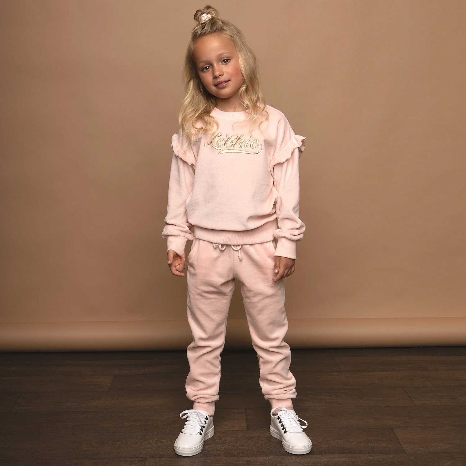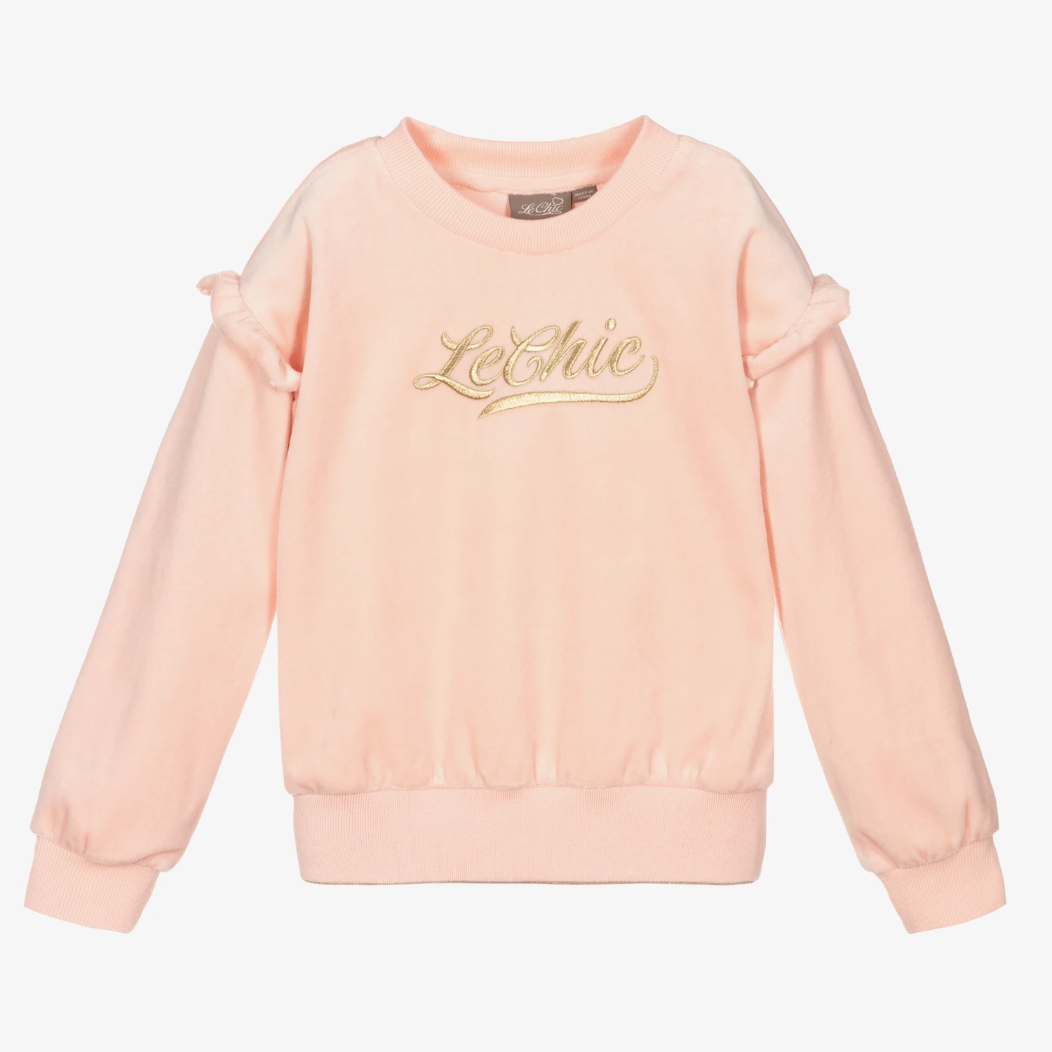 Girls lovely blush pink sweatshirt by Le Chic, made in soft and stretchy velour. It has gold logo embroidery on the front, pretty ruffles on the sleeves and ribbed trims.