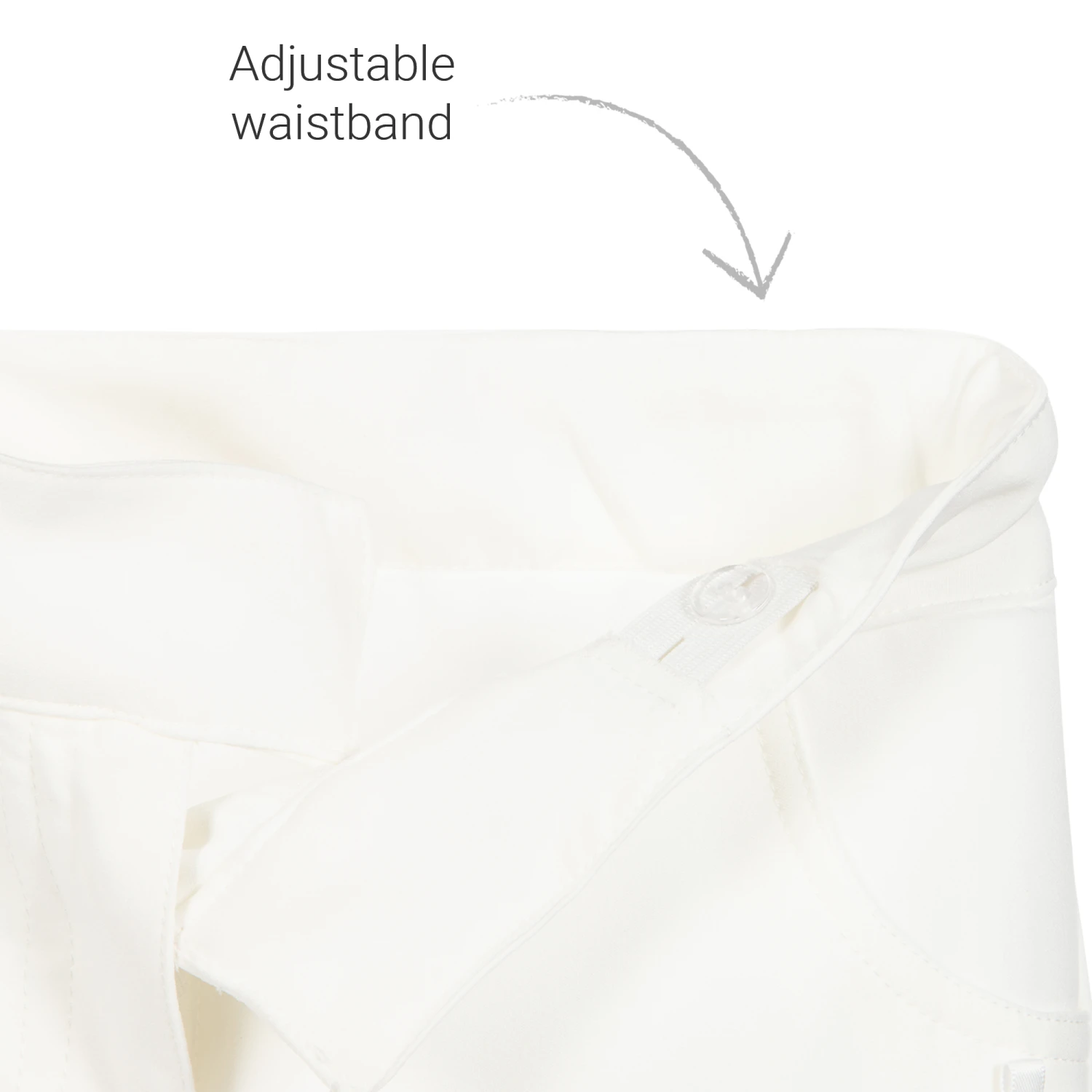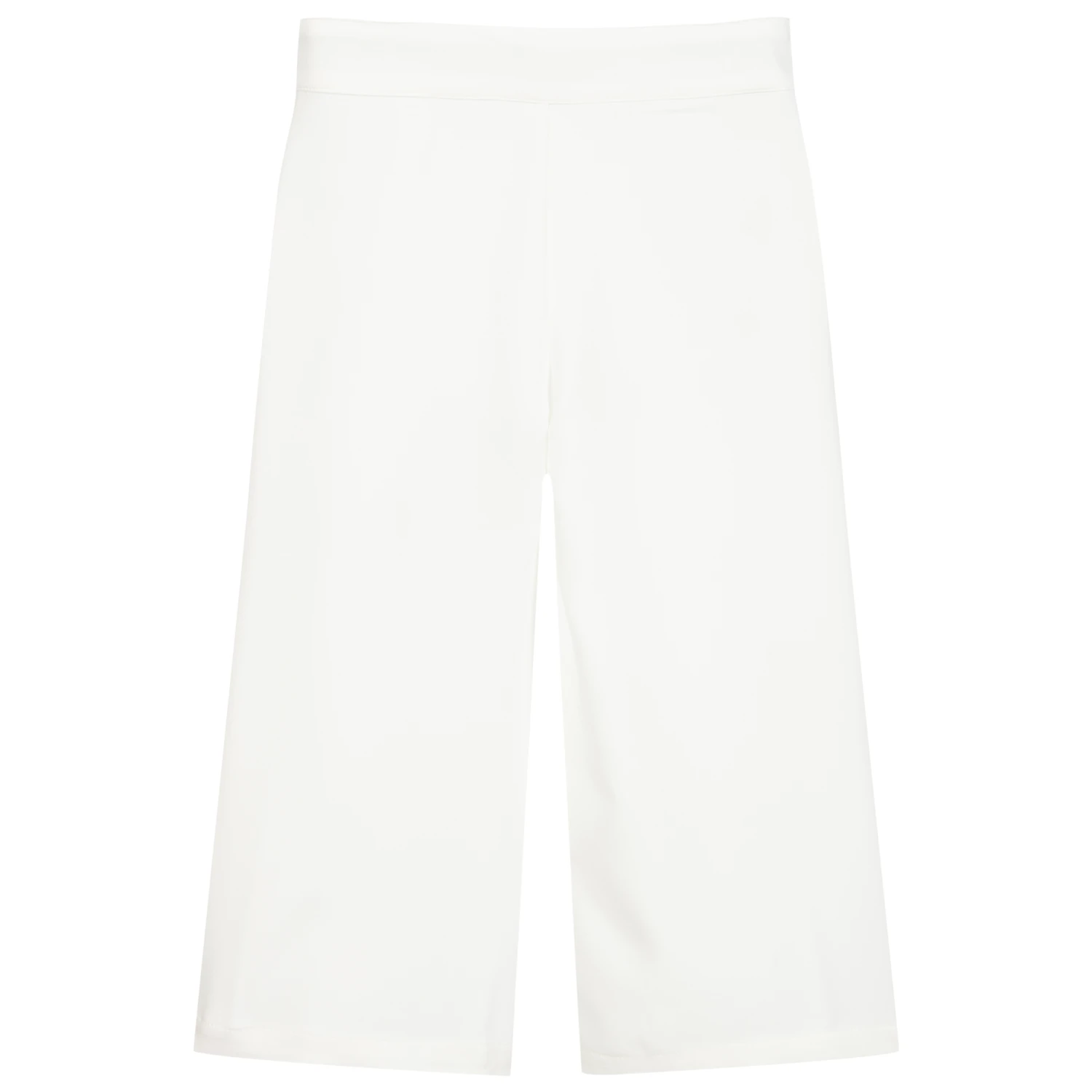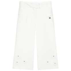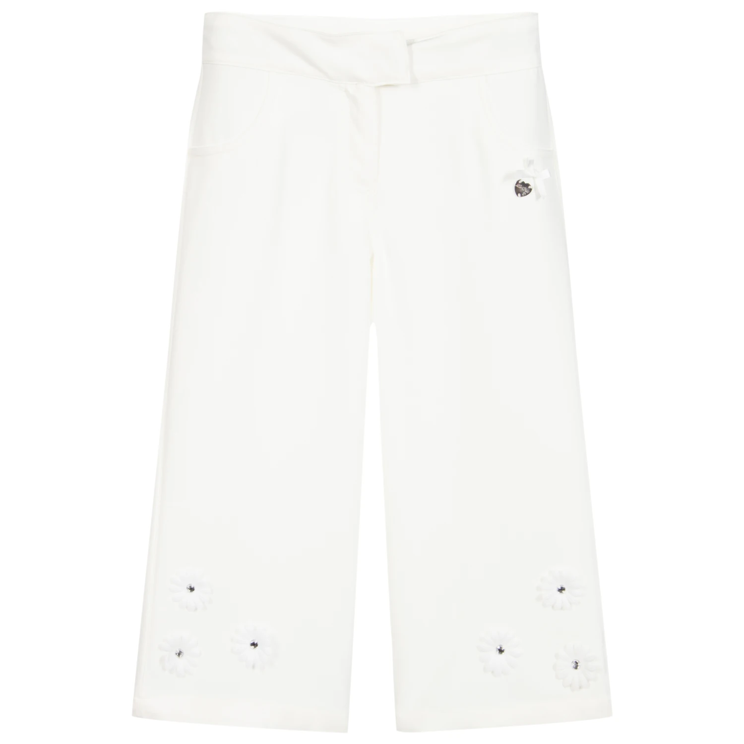 Off white wide leg trousers for girls by Le Chic, made in a soft and smooth polyester crêpe. They have pretty appliqué flowers on the hem of each leg with jewel centres. There are faux pockets and a useful adjustable waist and they fasten with a hook and zip.