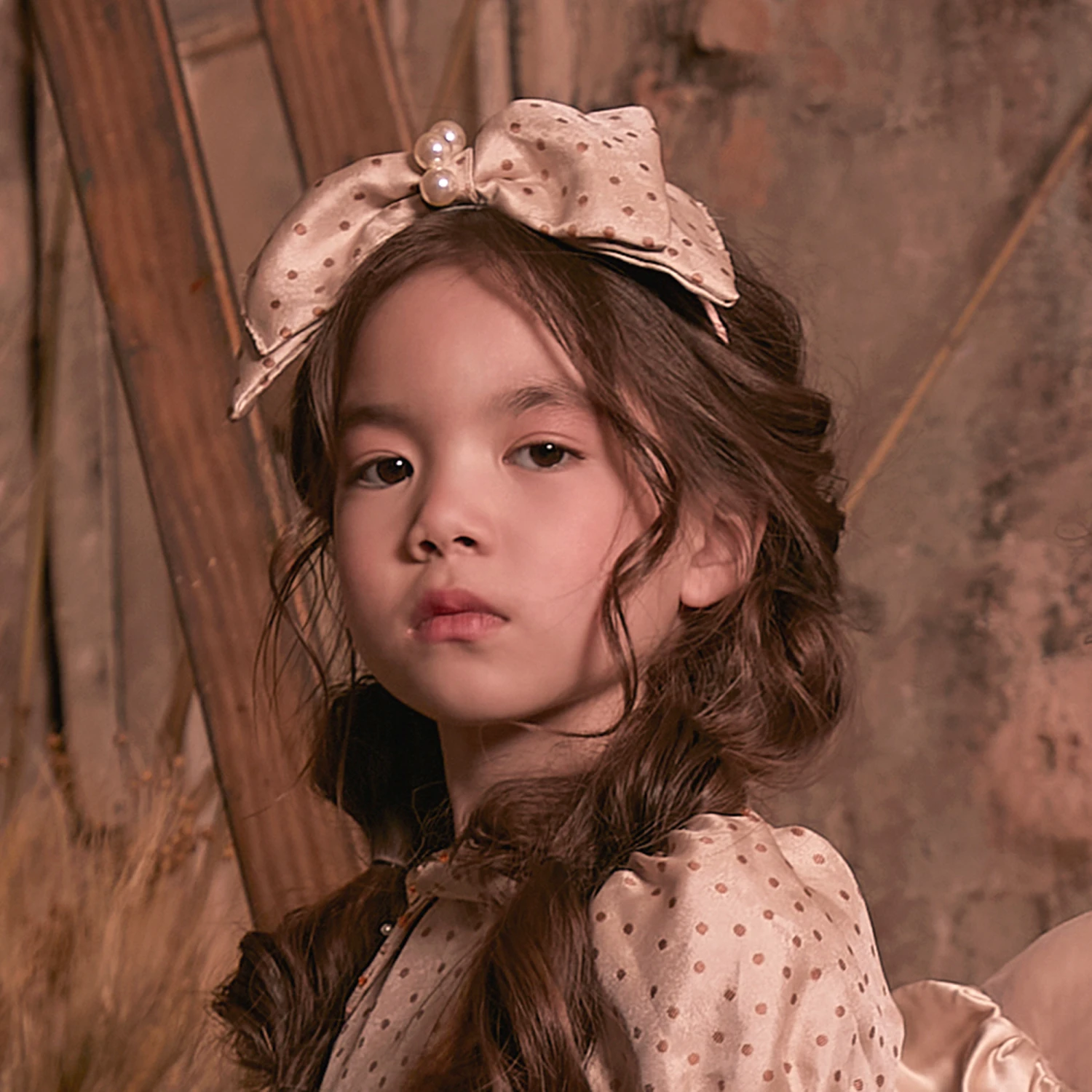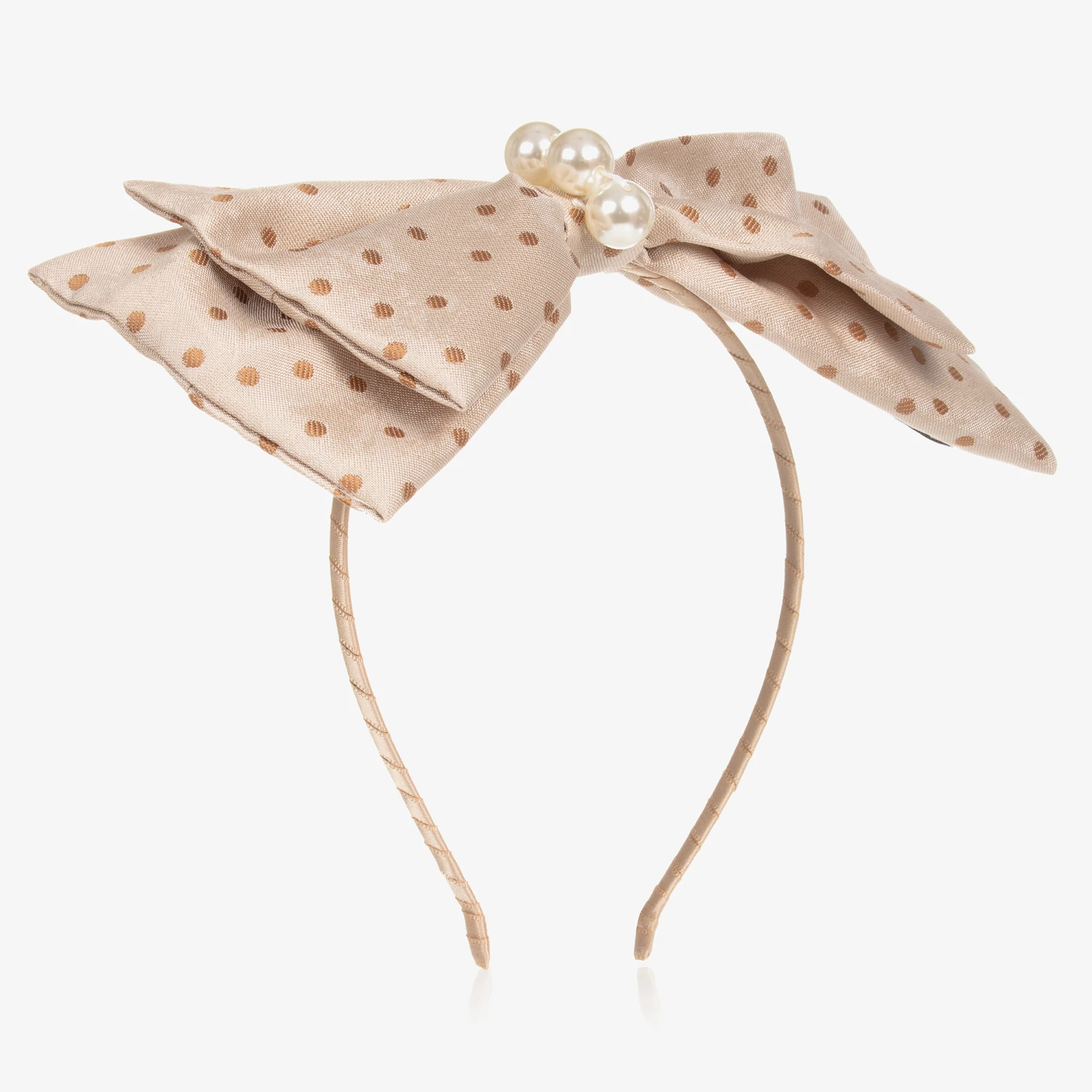 A lovely beige hairband for girls by British brand Le Mu, covered in satin ribbon. Adding extra charm to an outfit, this slim, flexible band is topped with an oversized bow in a cute polka dot design. There are faux pearls in the middle for a touch of sparkle.