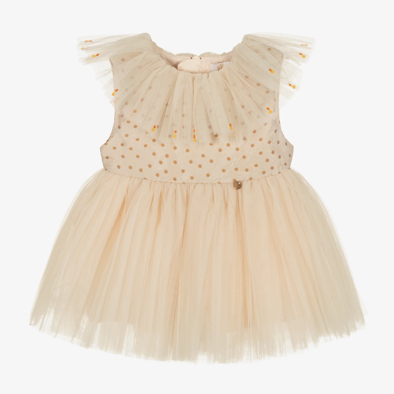 Pretty beige special occasion dress for younger girls by British brand Le Mu. It has a soft jacquard bodice patterned with dark beige polka dots, and a gathered tulle collar with orange bead and sequin detailing. The multi-layered, gathered tulle skirt has a sumptuous satin underlay and a golden logo charm sewn on the waist. The dress fastens with a concealed zip, is fully lined in voile for comfort and comes with coordinating satin knickers in the smaller sizes.