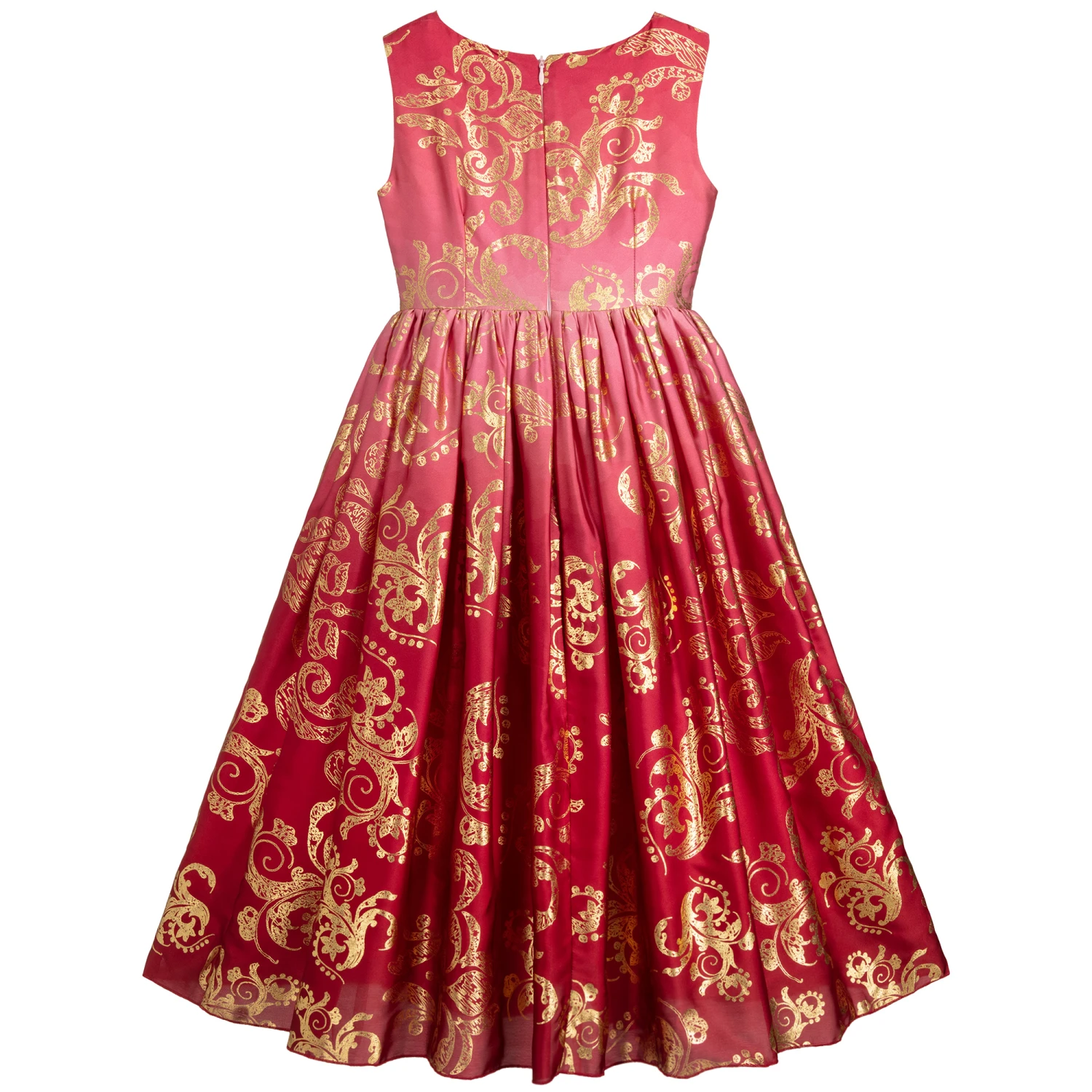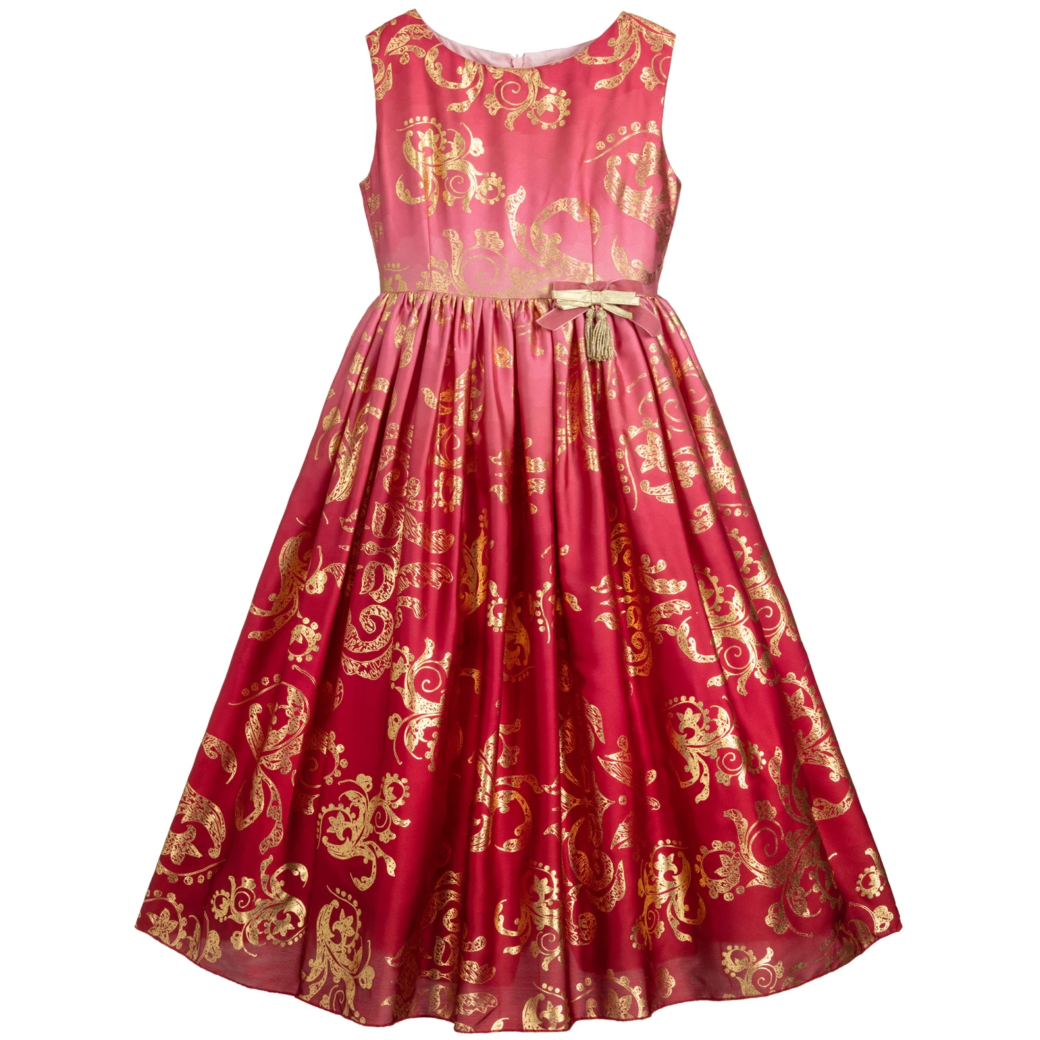 Girls elegant, full-length special occasion dress, Exclusive to Childrensalon, by Lesy. Lightweight and silky soft, with a deep pink to light pink ombré effect and stylish gold print. Lined in comfortable cotton, it has an under layer of soft tulle.