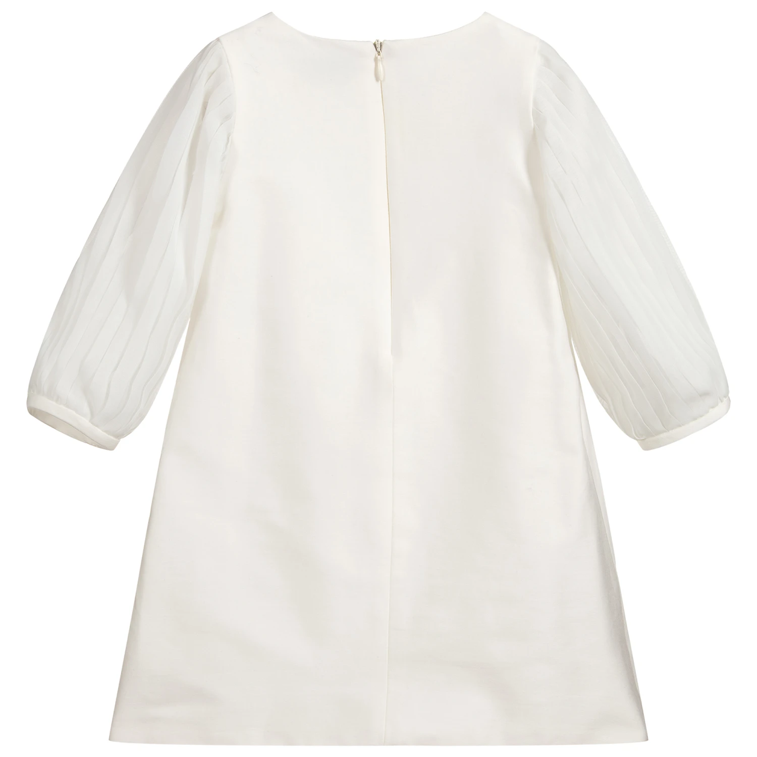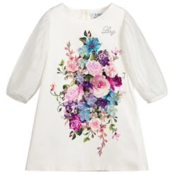 Special occasion ivory dress for girls by Lesy, made in luxuriously soft cotton sateen. The beautiful floral motif on the front is in shades of pink, blue and purple, with diamanté detailing. It has pleated sheer sleeves, with a sparkly logo on the bodice.