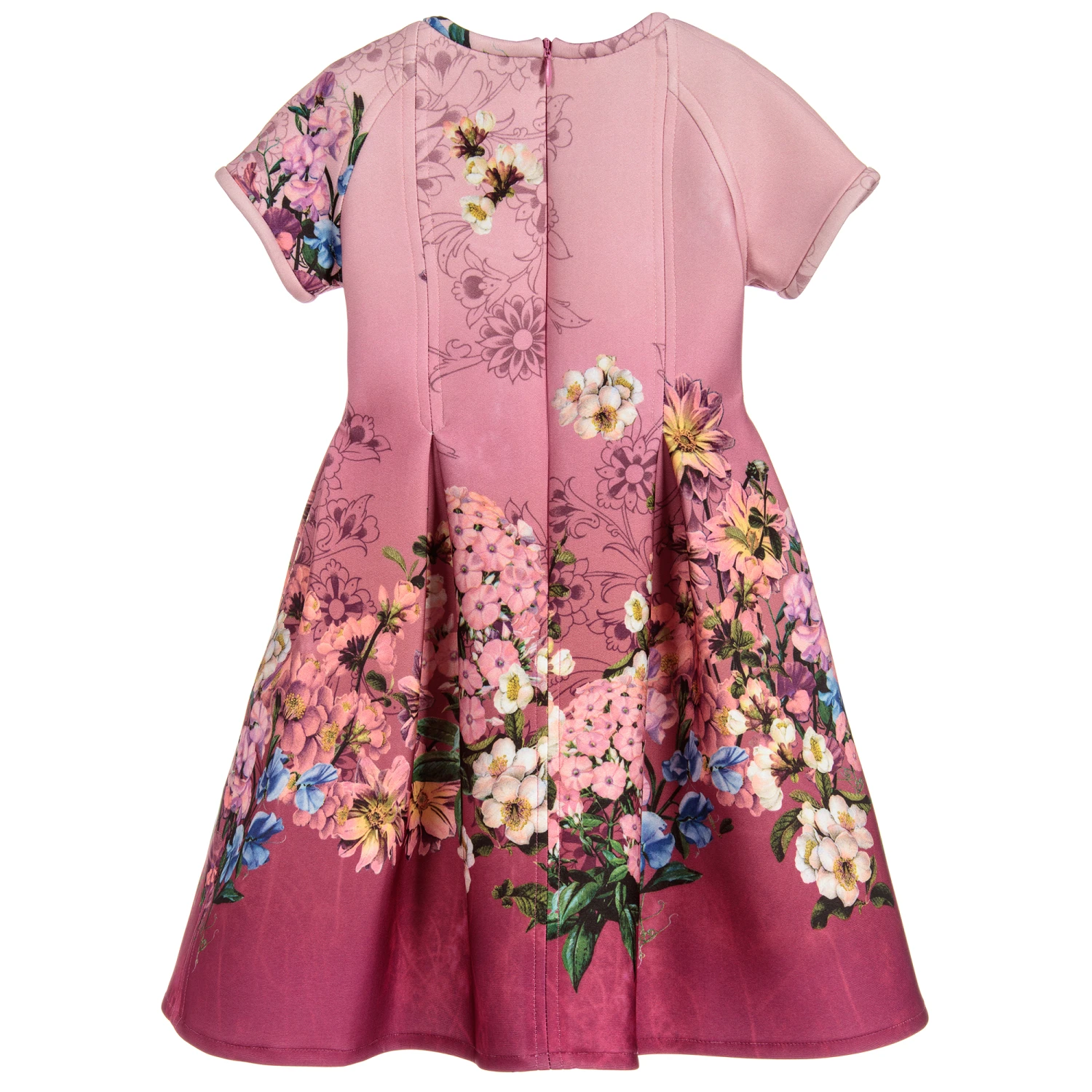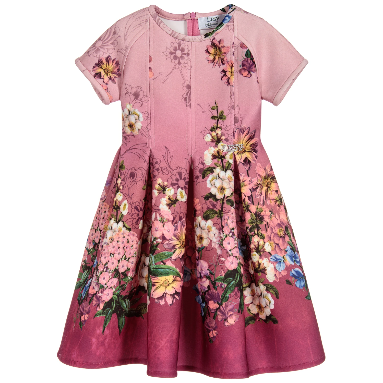 Girls pleated dress by Lesy, made in structured neoprene with a gorgeous pink floral print and diamanté logo charm on the waist.