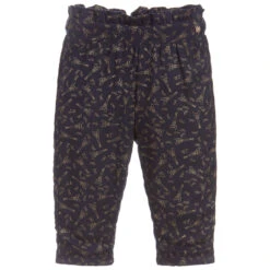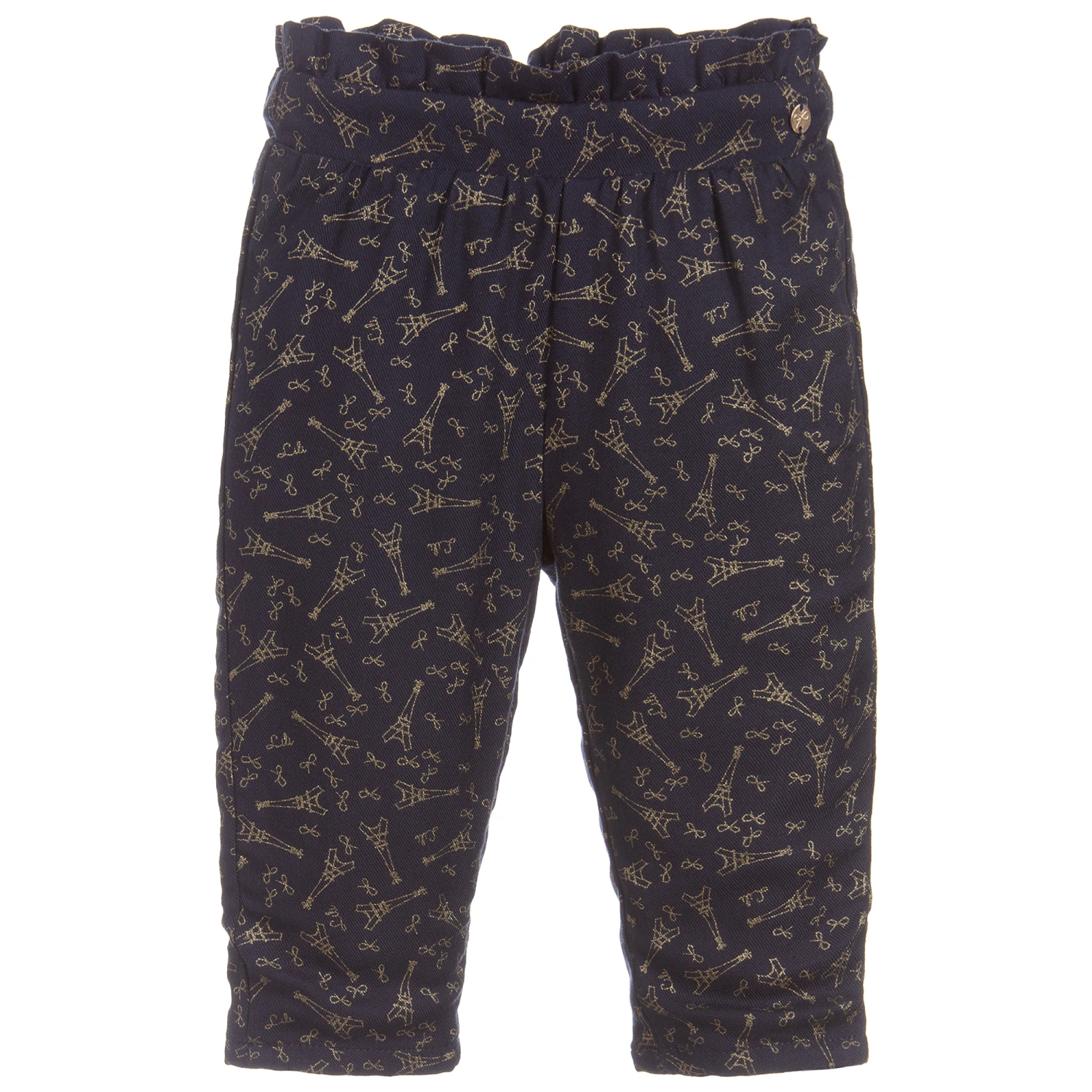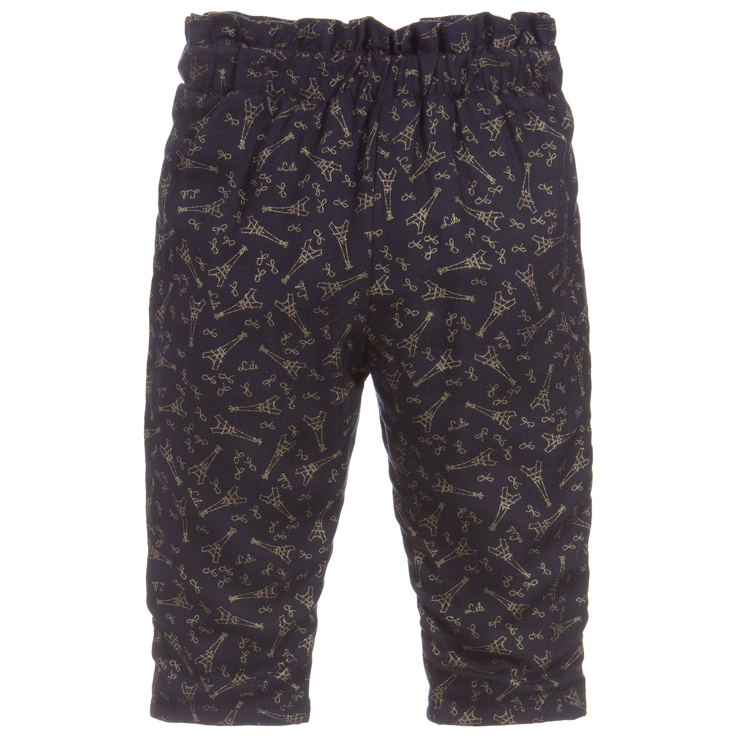Younger girls navy blue trousers from Lili Gaufrette, made in super soft viscose. They have a gold Eiffel Tower and logo pattern, with a soft cotton jersey lining. They have a comfortable elasticated waistband and simply pull on.