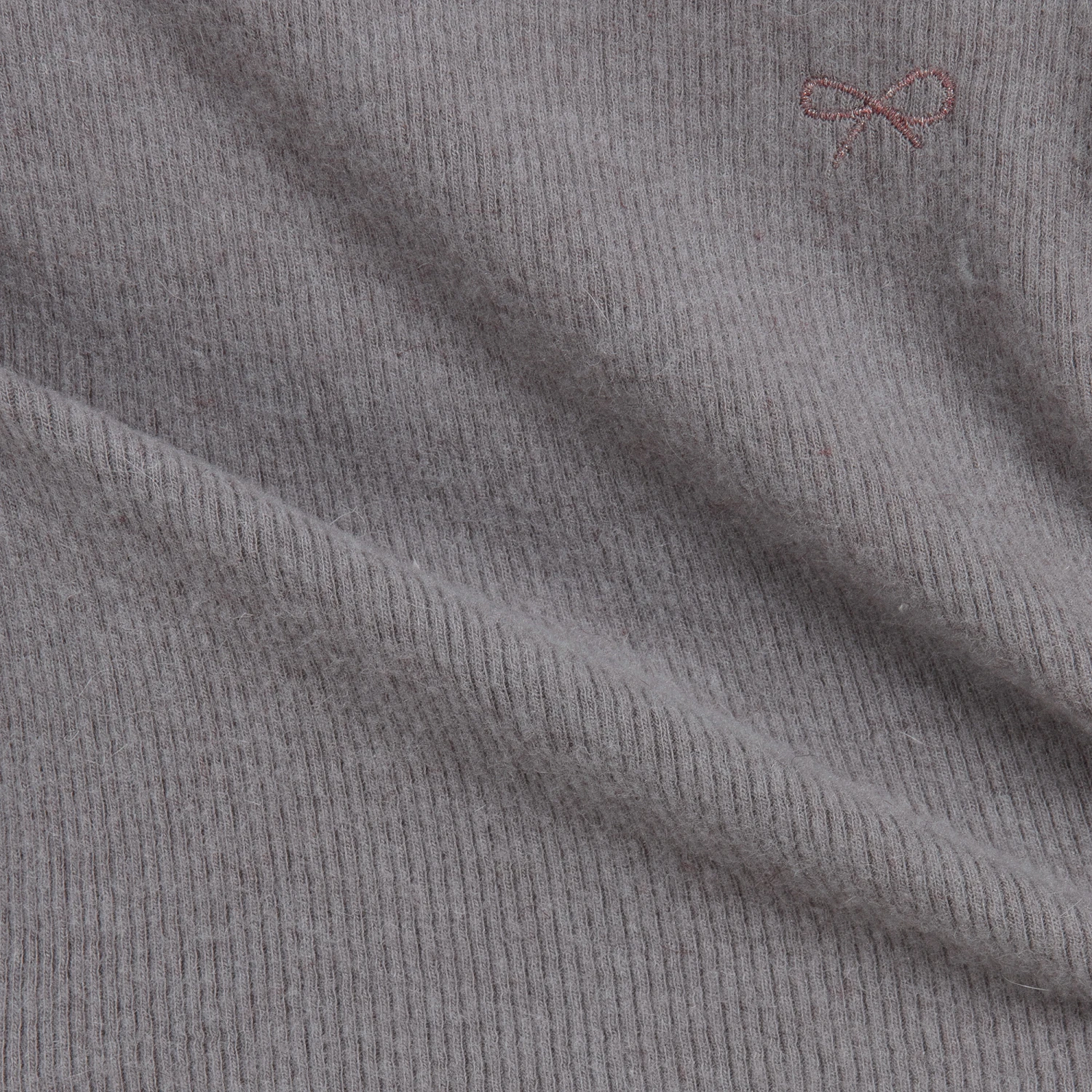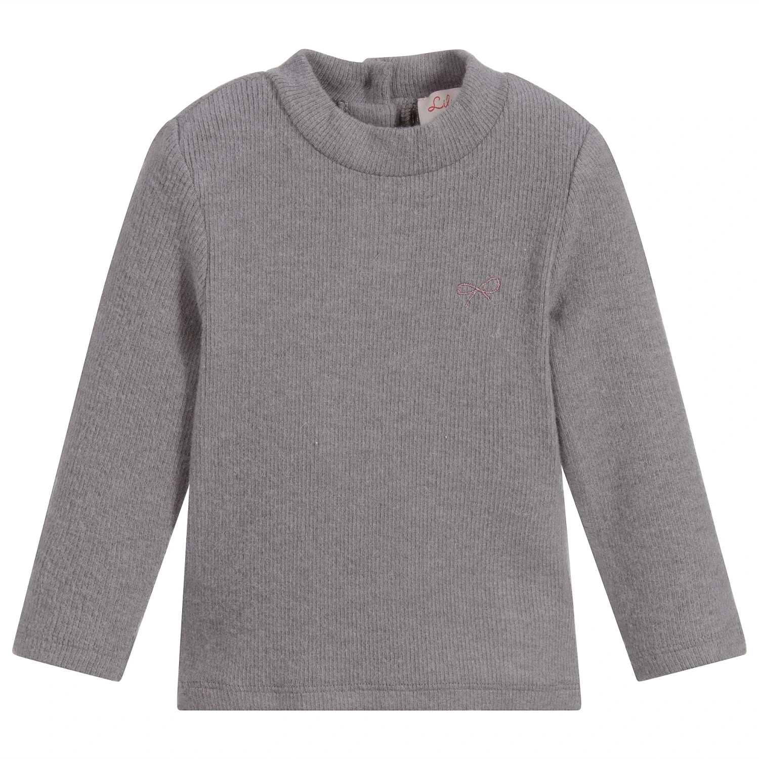 Younger girls grey ribbed top by Lili Gaufrette, made in super soft angora blend jersey. It has the designer’s pink bow logo embroidered on the chest.