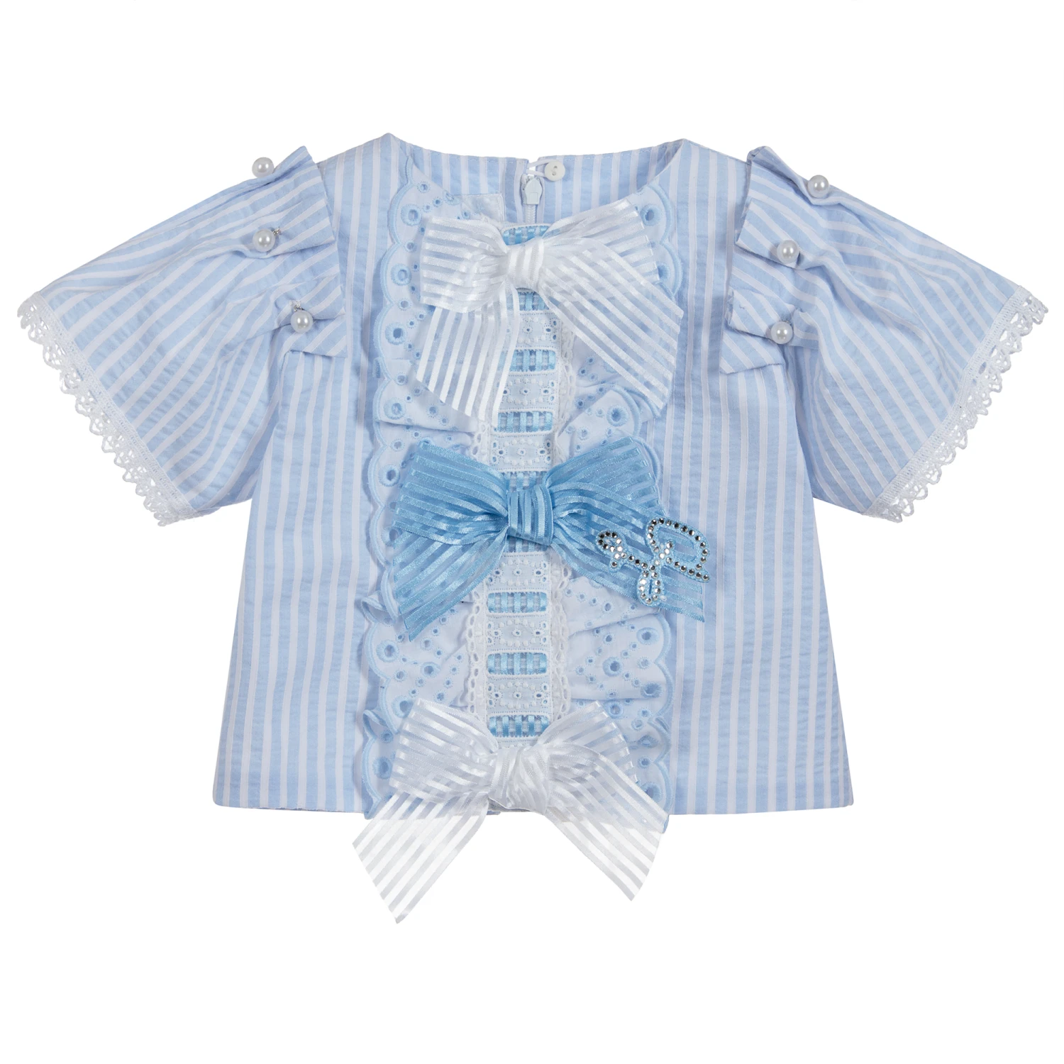 Girls blue and white striped blouse from Little Darlings. It is made in a lightweight cotton blend, with bows, lace, diamantés and pearl beads. Lined in a soft cotton blend, with a back zip fastening.