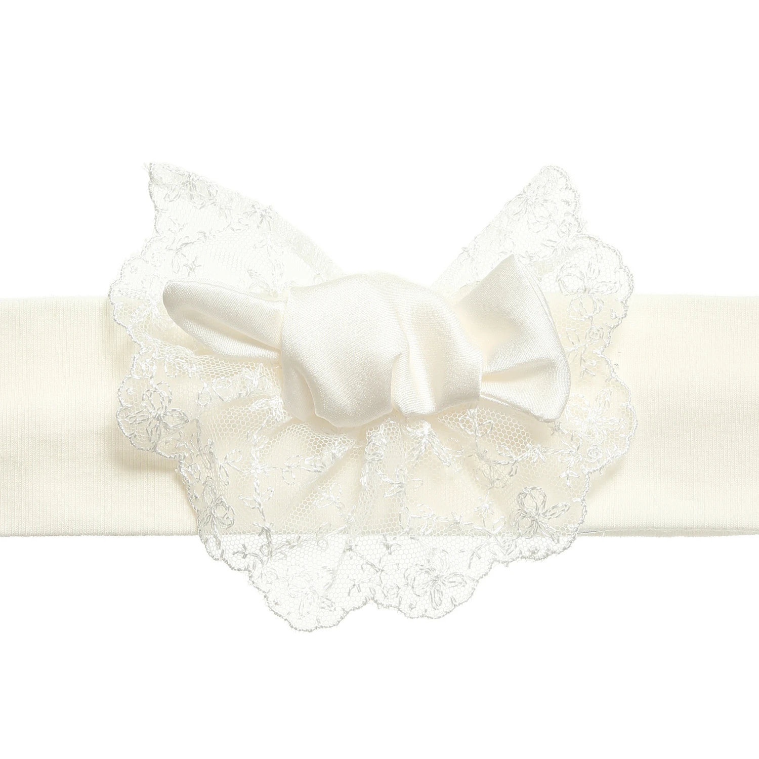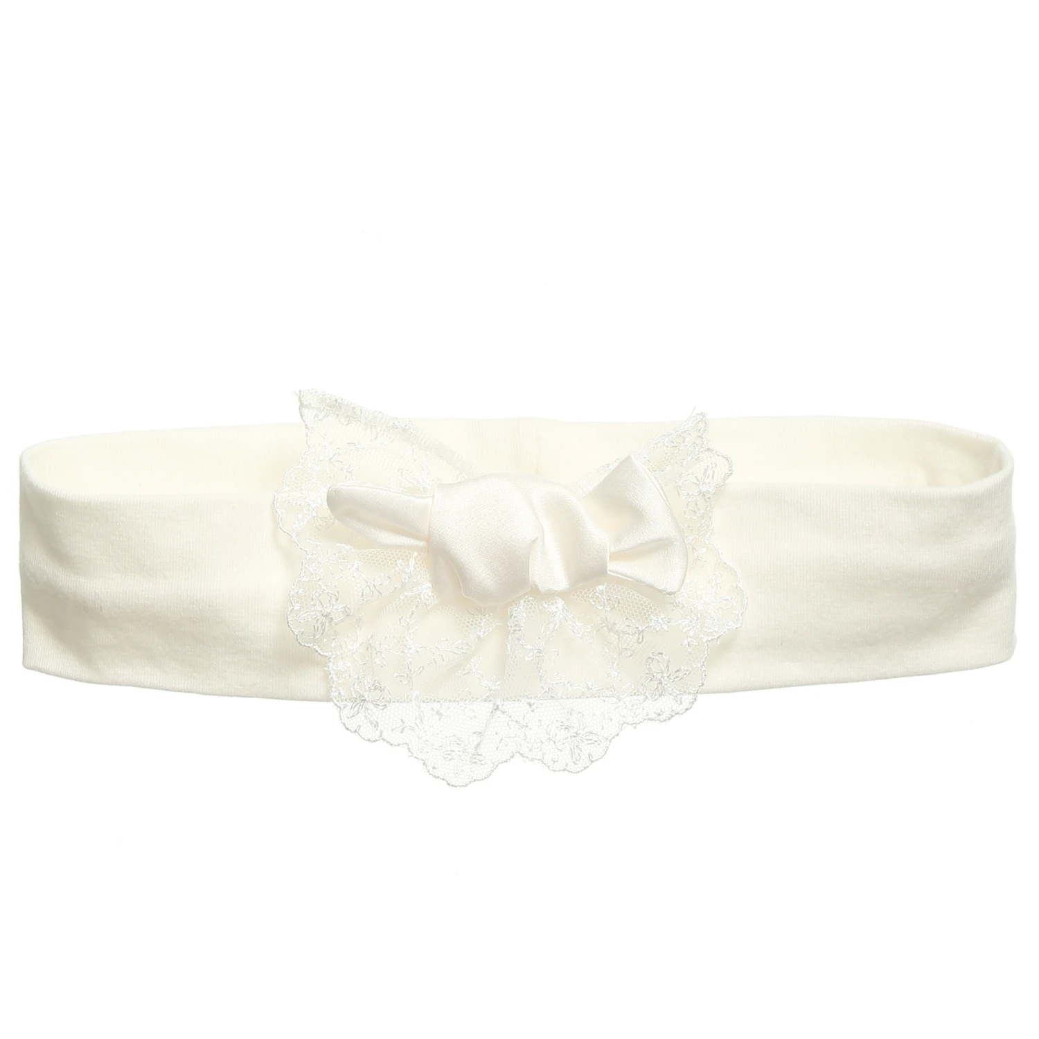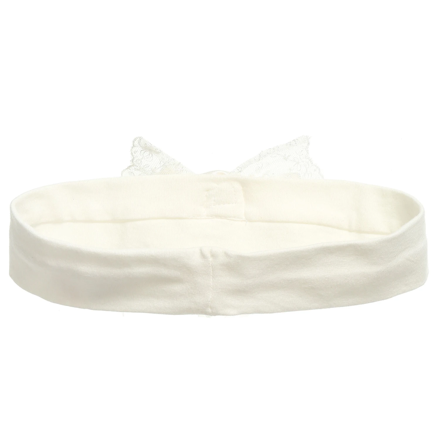 Girls ivory jersey headband with lace bow by Little Darlings Occasion. Made in soft and stretchy cotton, it has a side bow and lace decoration.