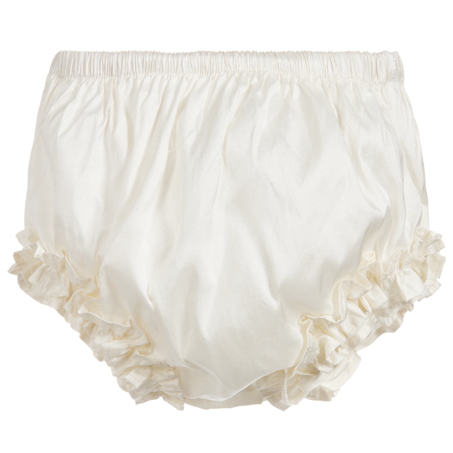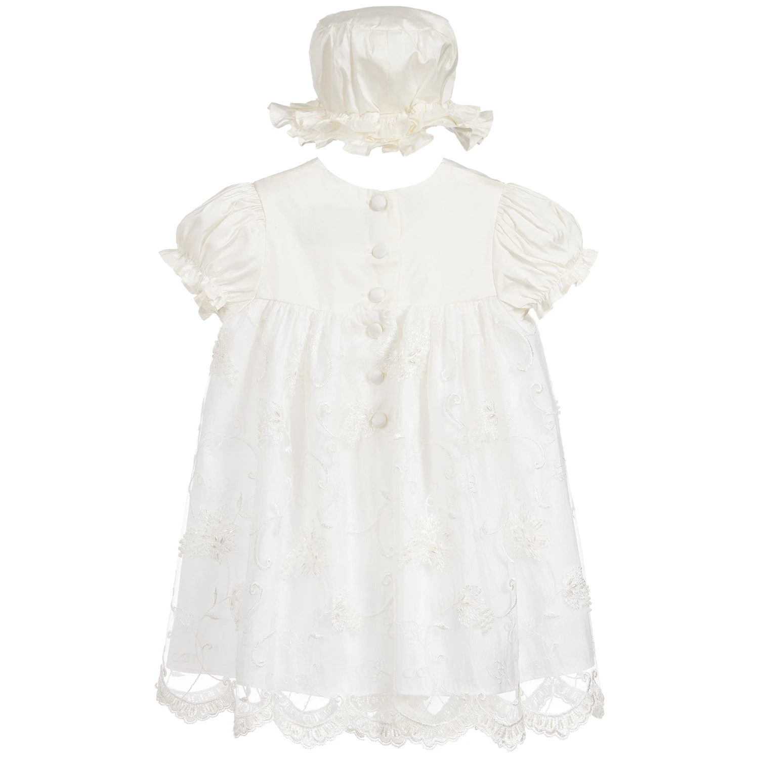 Gorgeous ivory silk three-piece Ceremony outfit by Little Darlings Occasion. Designed for baby girls, the set has a beautiful dress with a fitted ruffle bodice and capped short sleeves, with matching knickers and hat. The tulle overlay is embroidered with a delicate floral design with sequins and beads and has a scalloped edge and does up at the back with silk covered buttons. The knickers are made in pure silk and have an elasticated waistband and leg holes with ruffle trims.