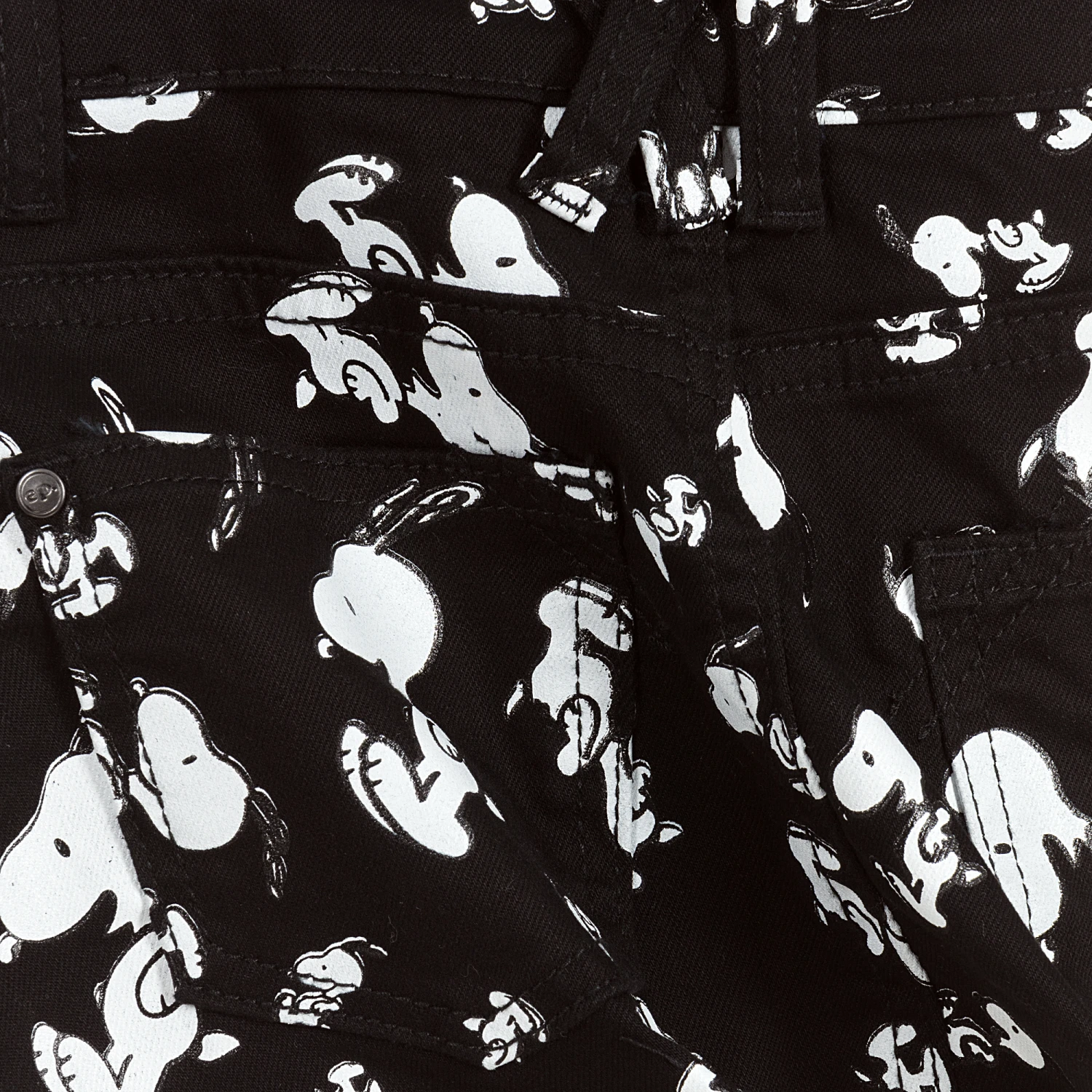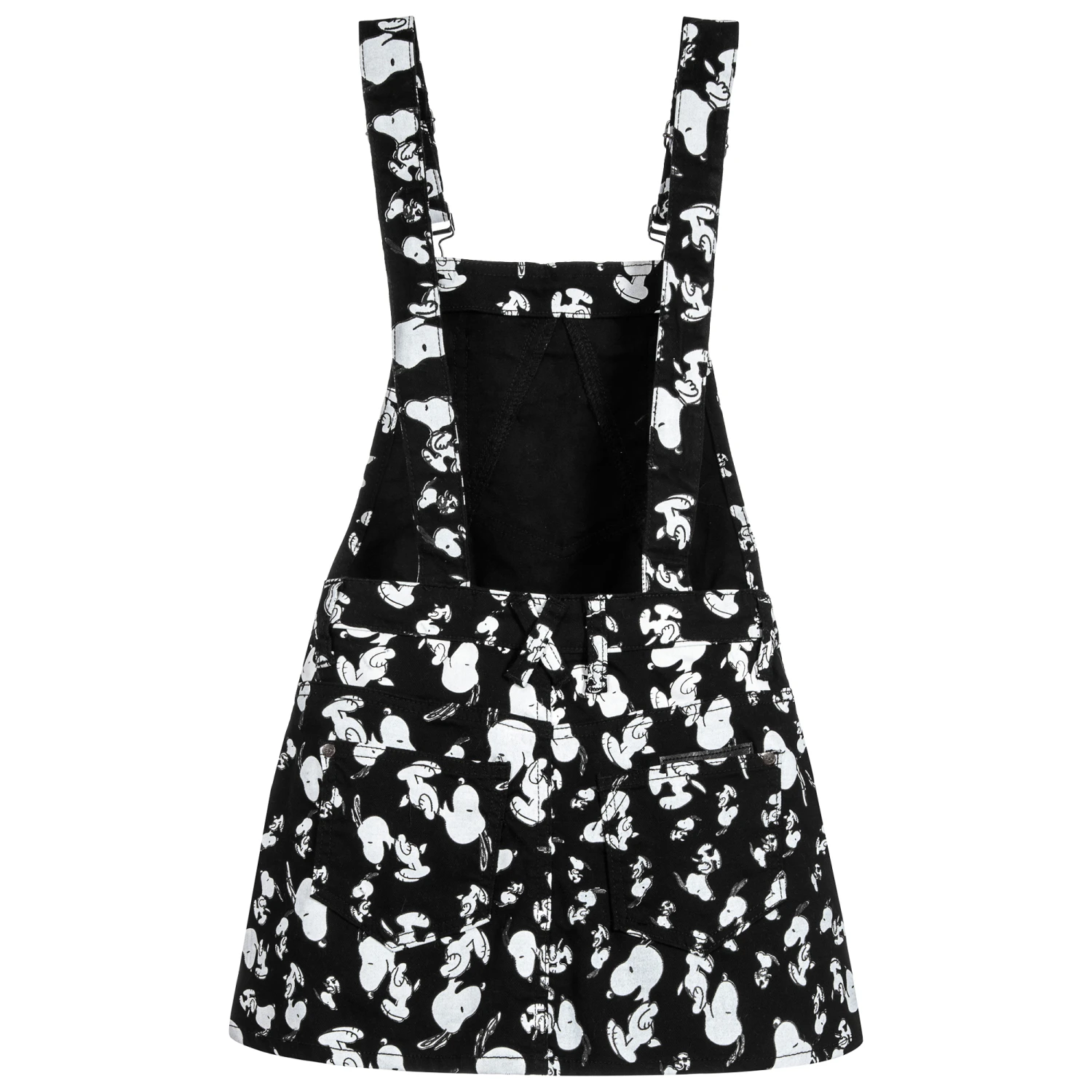 A fun, black pinafore dress by Little Eleven Paris, patterned with Snoopy, from the comic strip Peanuts by Charles M Schultz. Made in mid-weight cotton twill, it has pockets on the bib, sides and back and adjustable shoulder straps, perfect for growing girls.