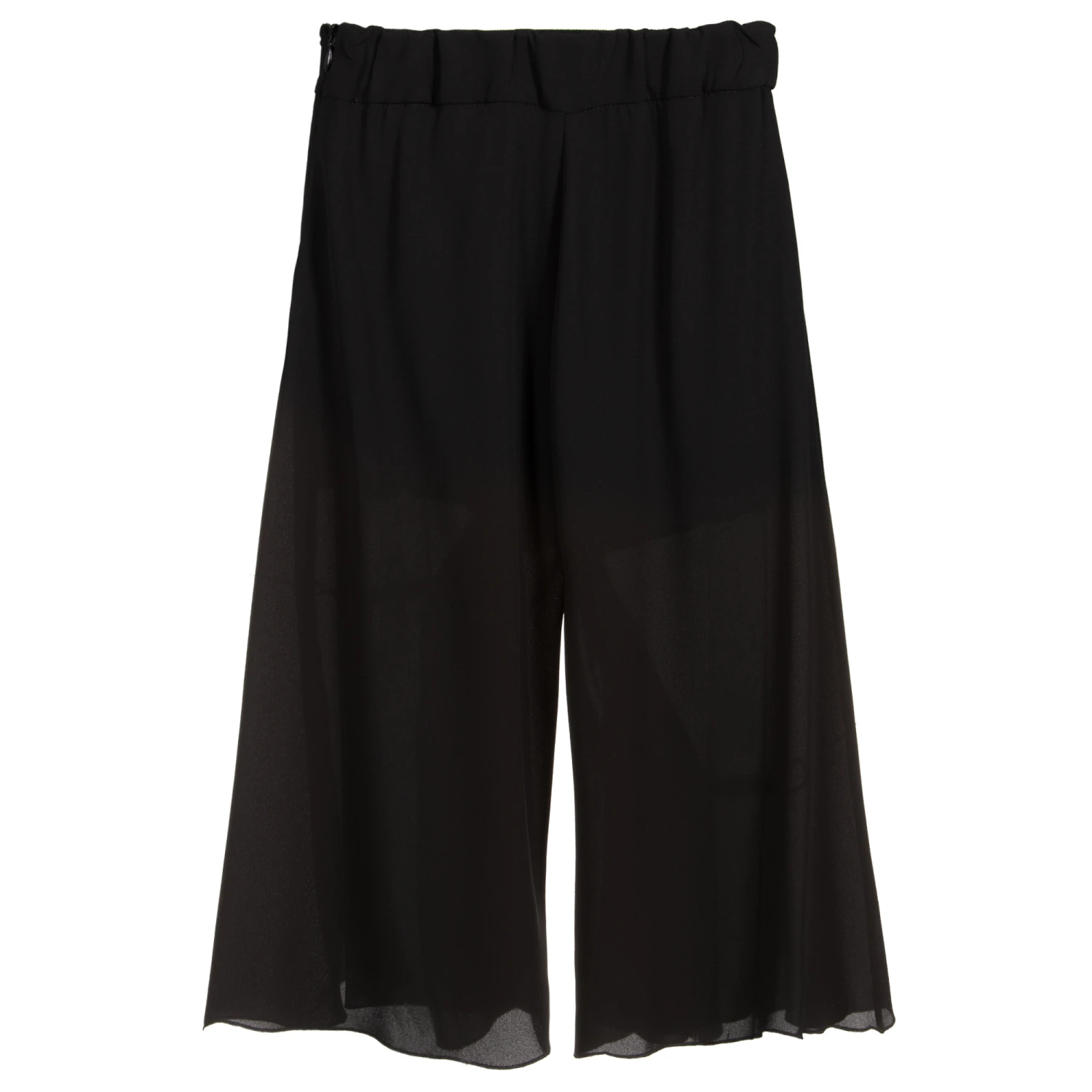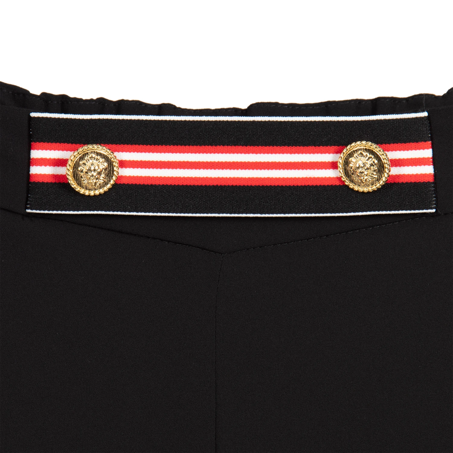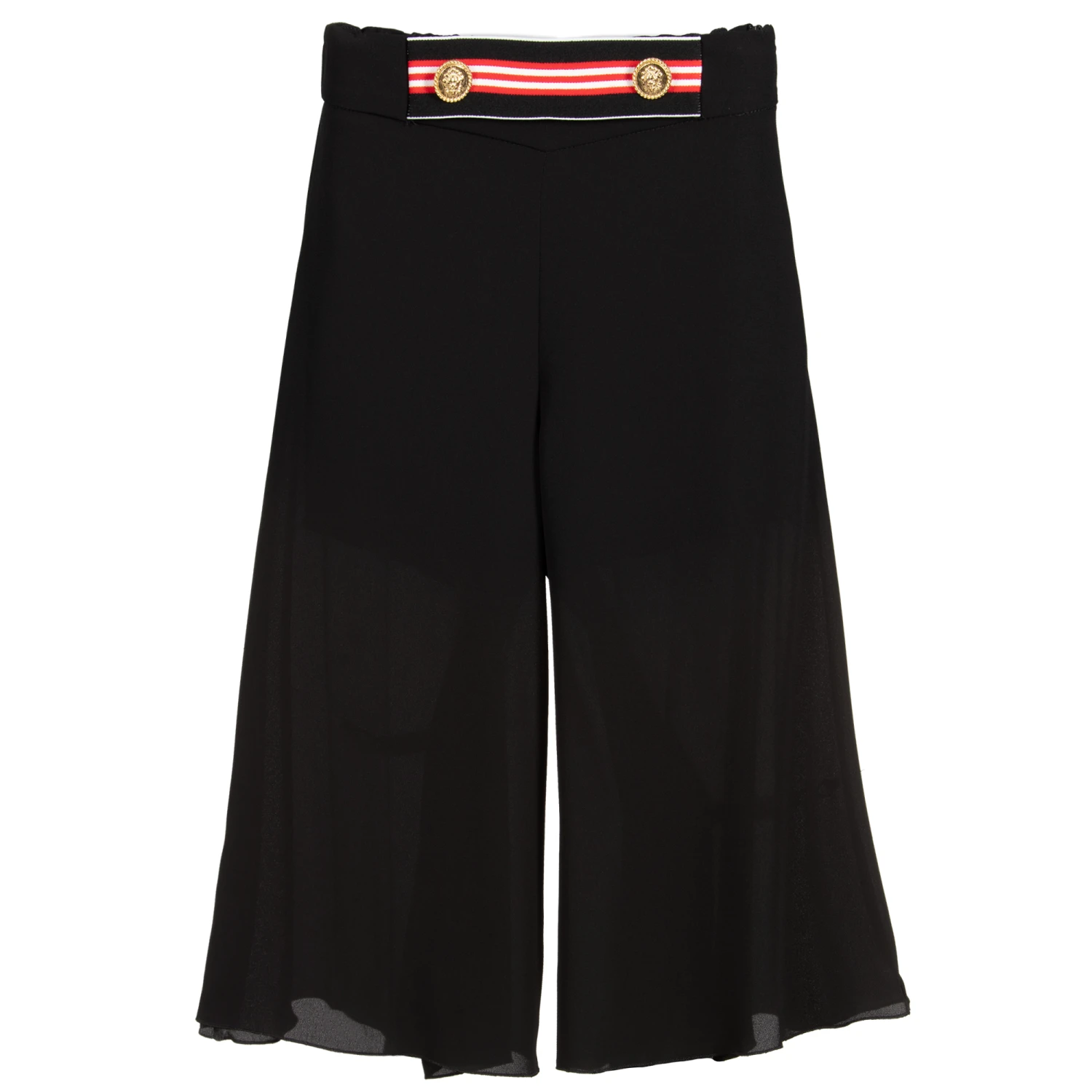 Girls black crêpe chiffon culottes by Loredana, with a striped elasticated panel and decorative gold buttons on the waist. They have wide, flared legs and super soft red jersey shorts lining. The waistband is elasticated on the back and they have a concealed zip fastening on the side.