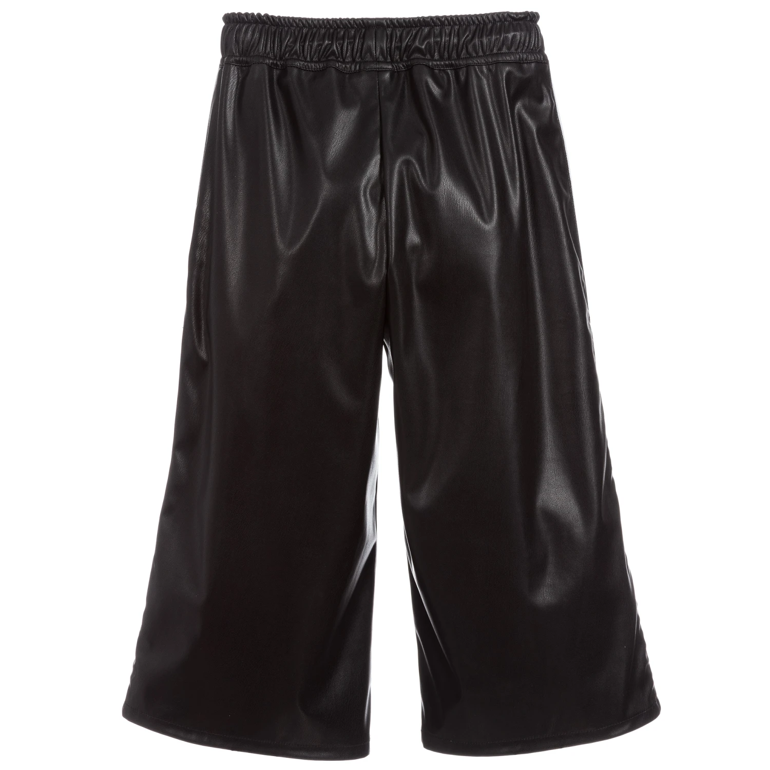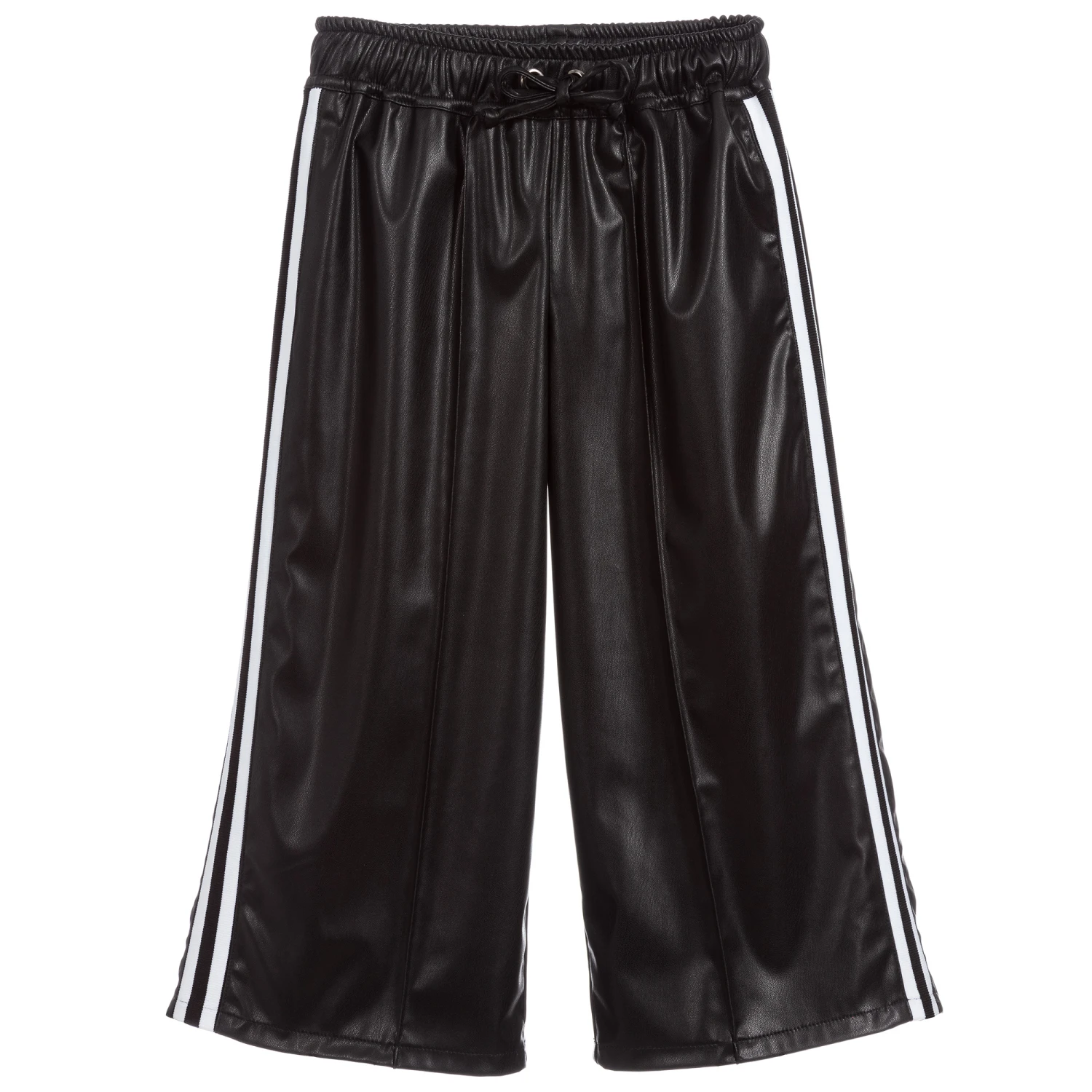 Made in soft, supple, black faux leather, these culottes for girls are by Loredana. They have a sporty look, with black and white stripes along the outside seams of the legs and a useful drawstring waistband.
