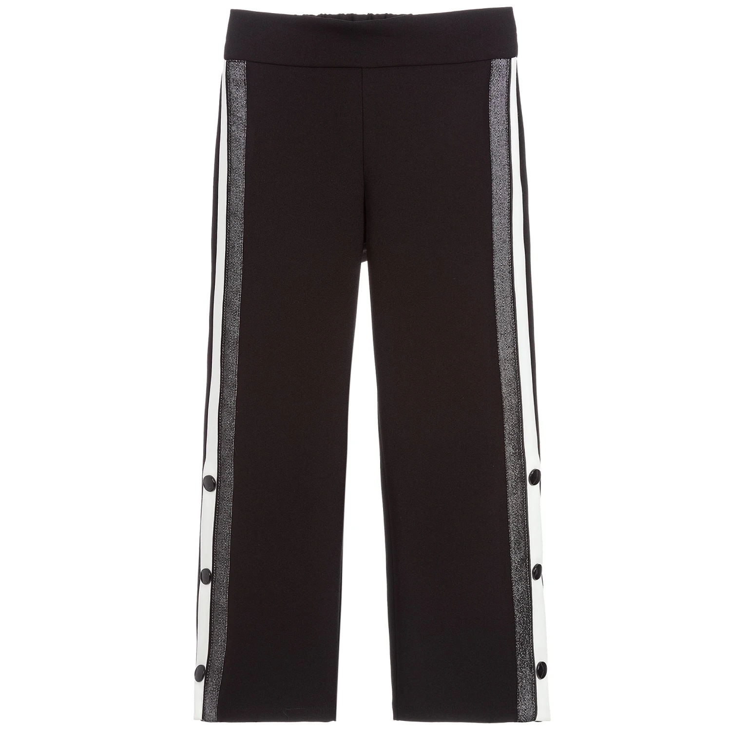 Girls black crêpe trousers by Loredana, with an elasticated waistband and side zip fastening. They have sparkling silver and white stripes down the sides and popper fastenings on the lower legs.