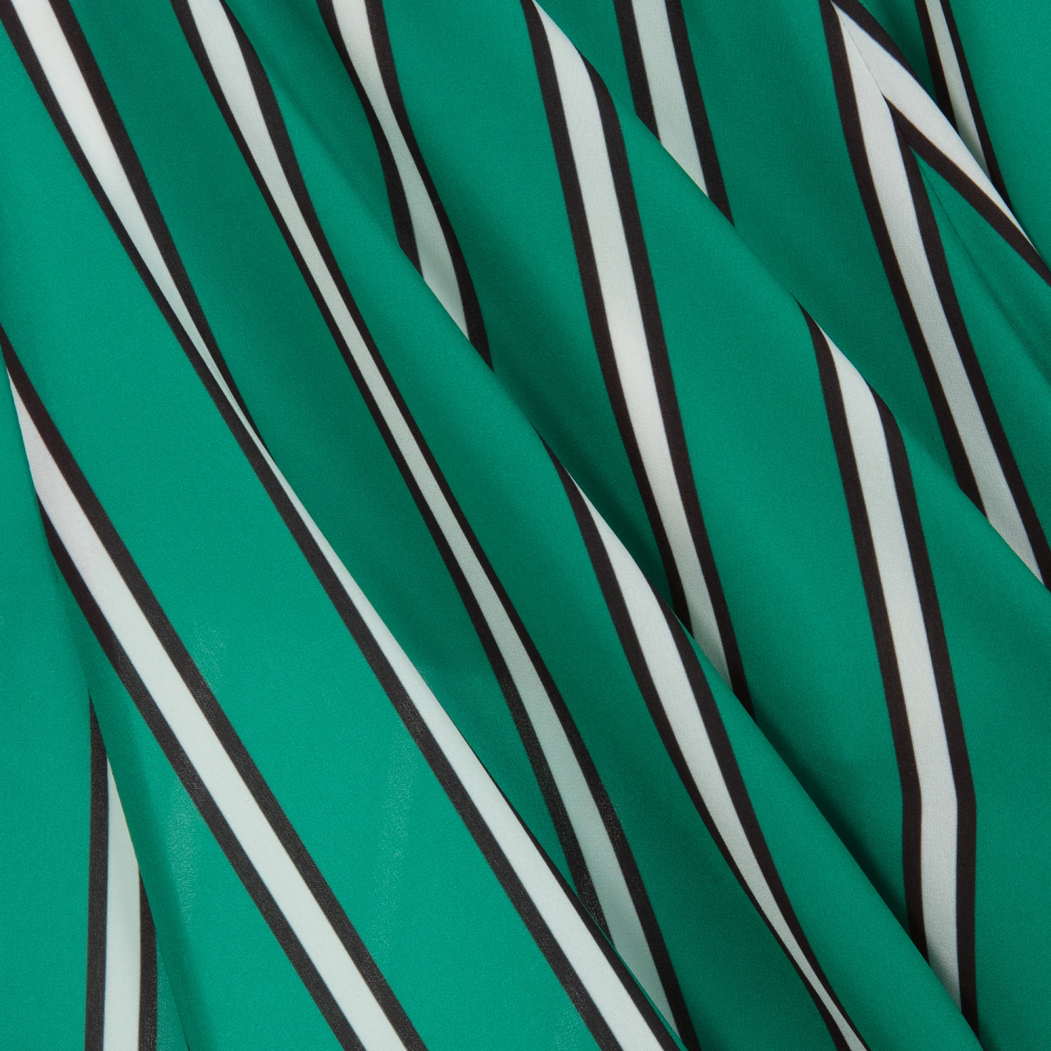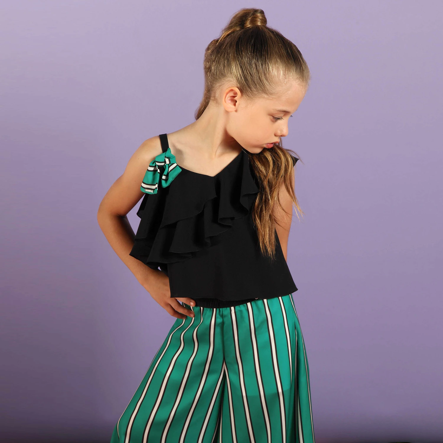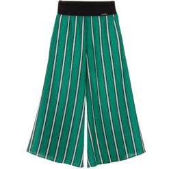 Girls silky green culottes for girls from Loredana, with striking black and white stripes. They have wide, flared legs and soft white jersey shorts lining. The wide, black elasticated waistband is ribbed and has a small gold metal logo tab.
