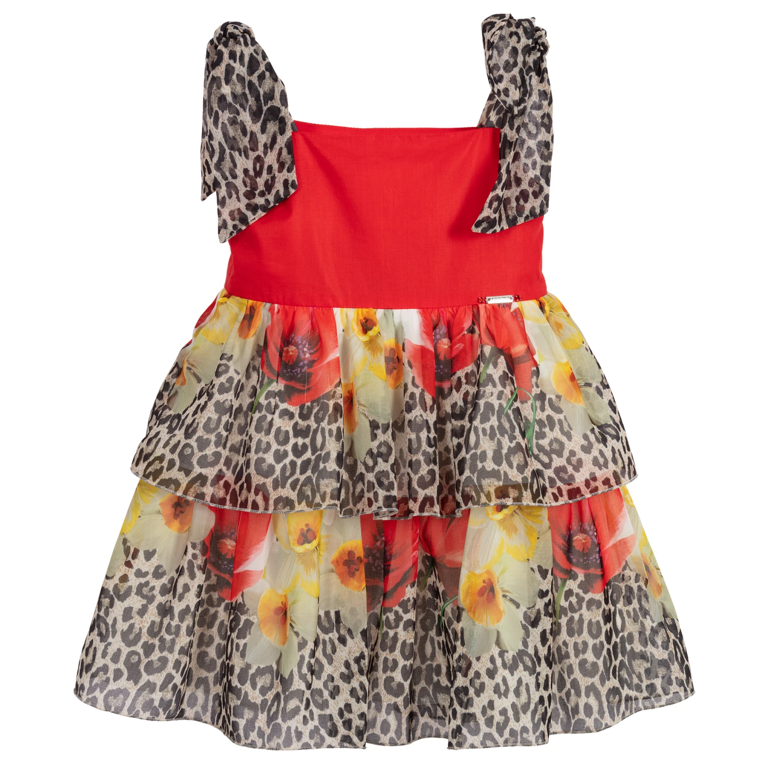 A beautiful red and leopard print dress for girls by Loredana, with a gorgeous print of yellow daffodils and red poppies. The bodice is made in comfortable red cotton. The skirt has layers of soft, printed chiffon and ivory polyester crêpe chiffon, lined in soft cotton.