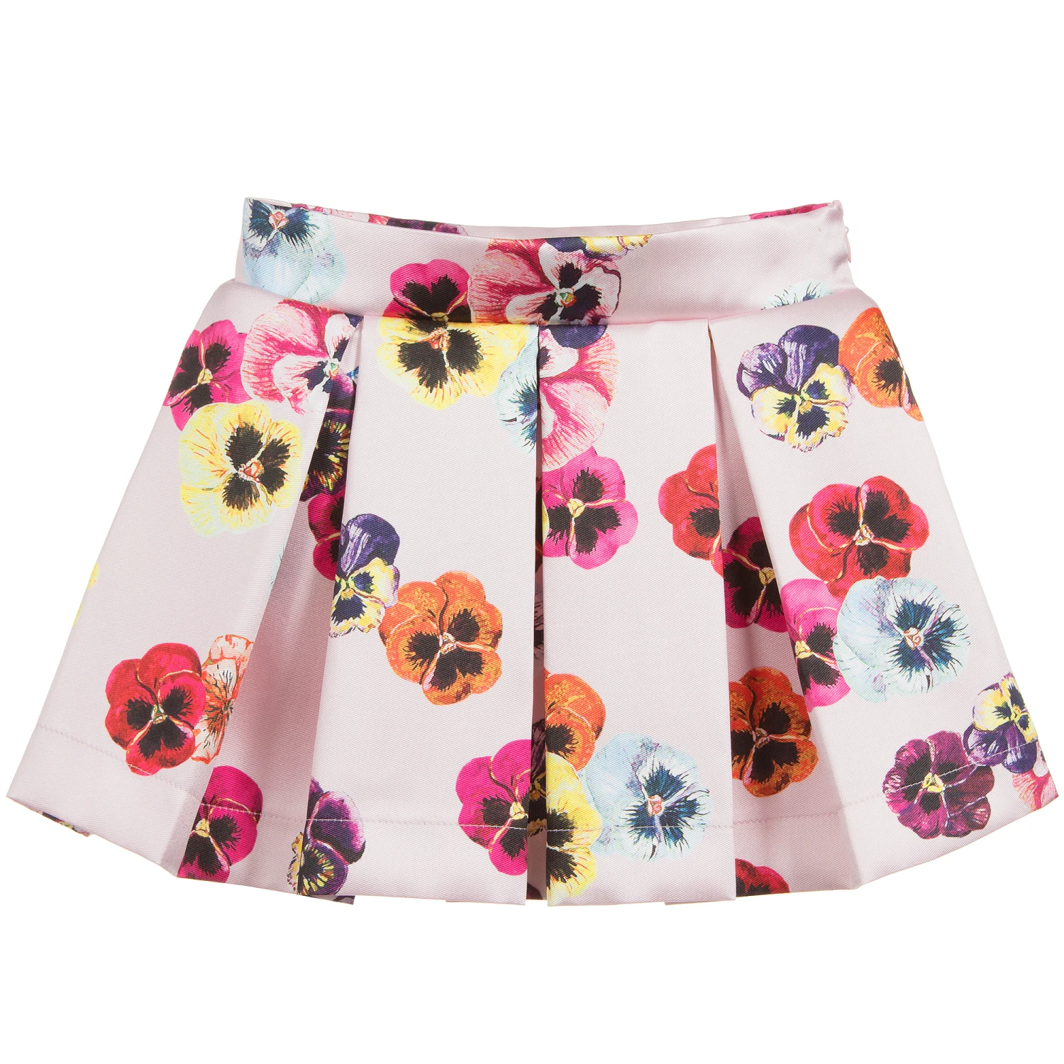 Delightful pale pink, polyester satin pleated skater skirt for girls, by Love Made Love, with a beautiful pansy floral print. It has a lightweight silky lining and an adjustable waistband for the perfect fit.
