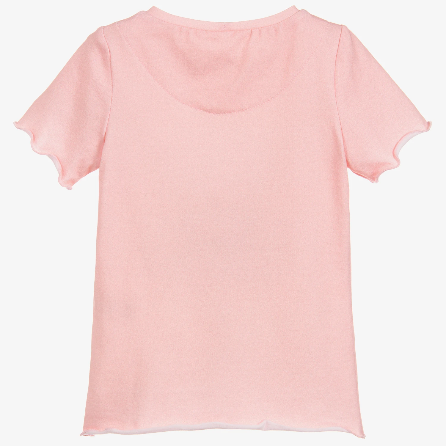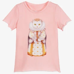 Pale pink short sleeve T-shirt in soft stretch cotton featuring a beautiful white cat print in a regal Tudor costume.