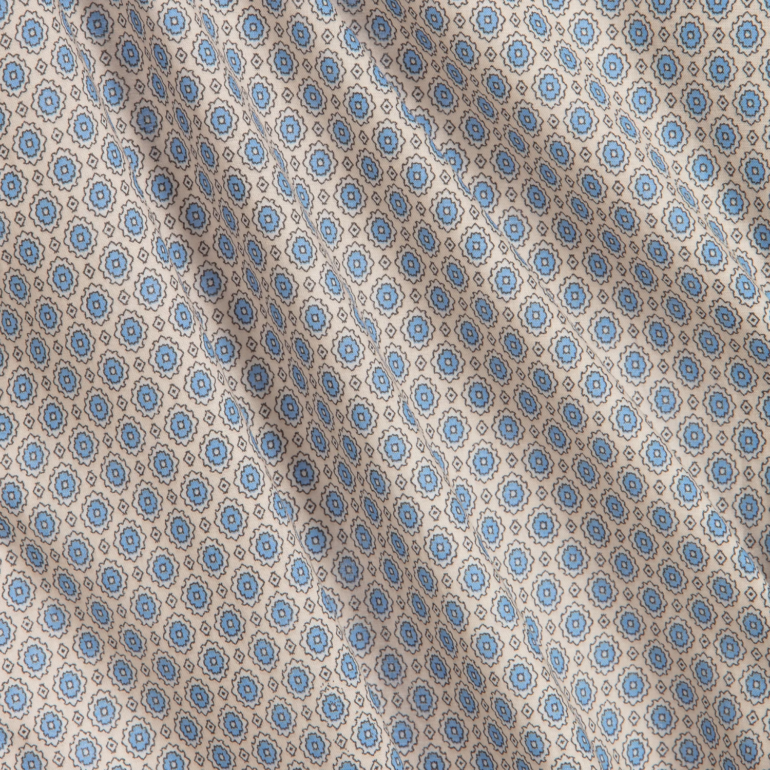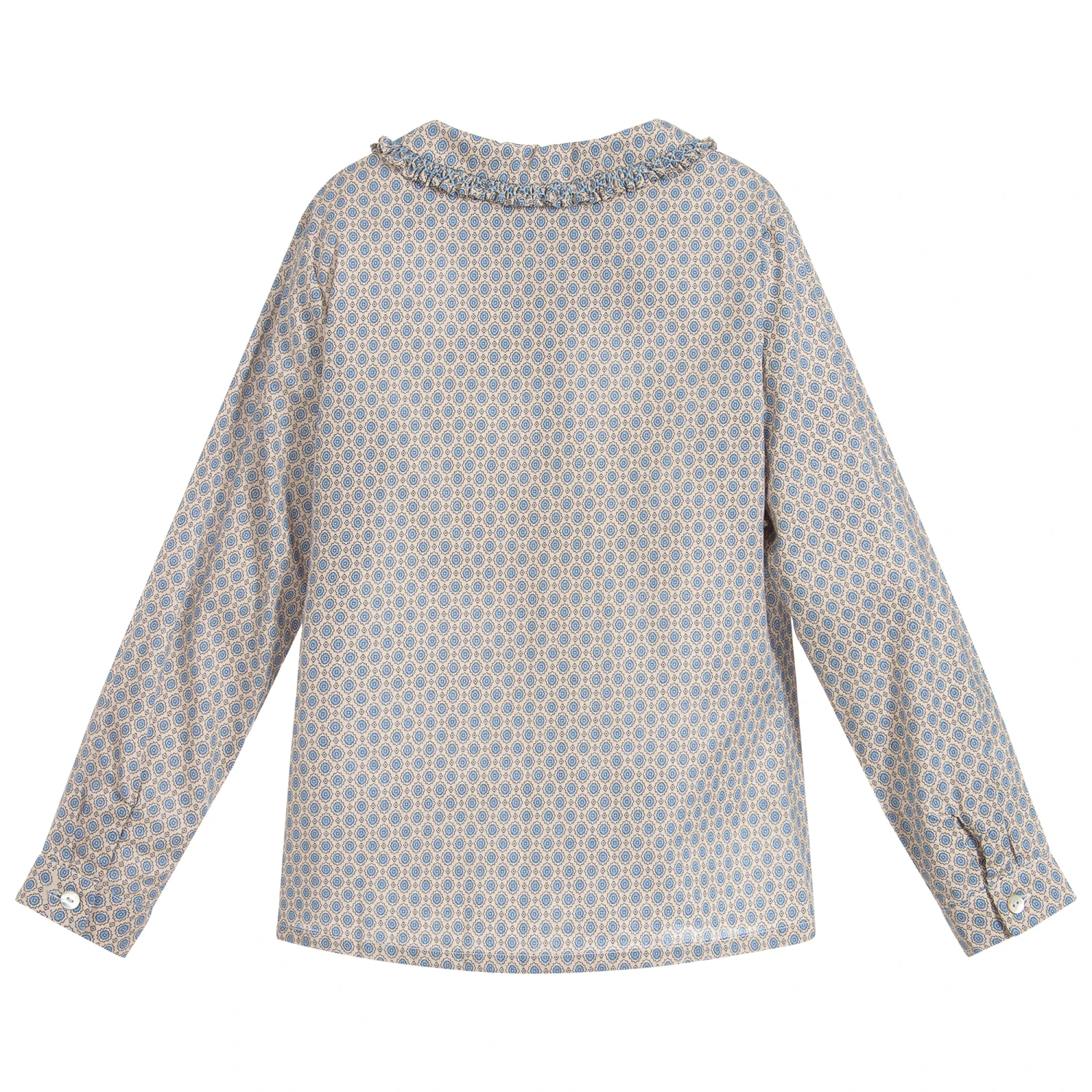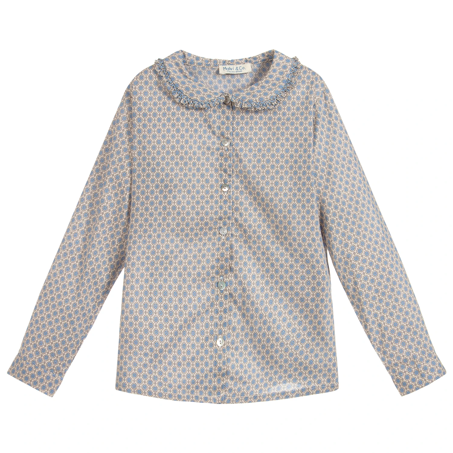 Girls grey and blue patterned shirt by Malvi & Co, made in soft cotton. The round collar has pretty hand embroidery detailing in blue.