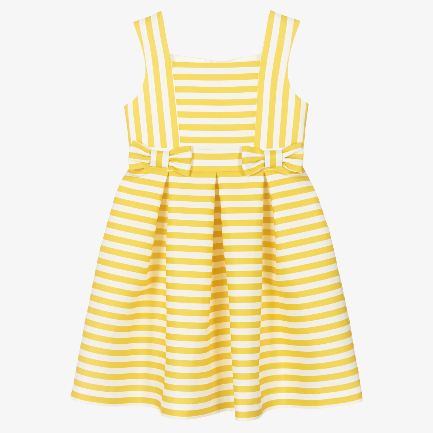 Smart yellow and white striped dress for girls by American brand Mama Luma. Handmade in sumptuous, lightweight satin, it has fixed bows on the waistline and a full, box-pleated skirt. It is fully lined in cotton voile for comfort and has a neat, concealed zip fastening around the back.