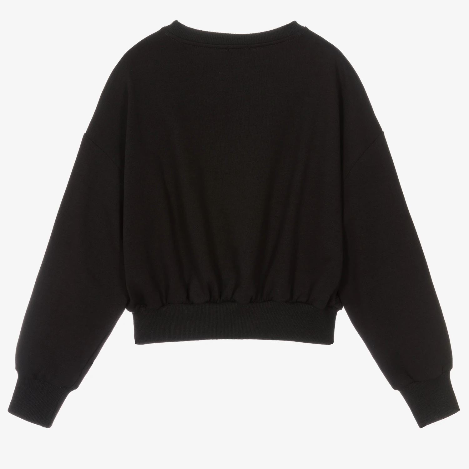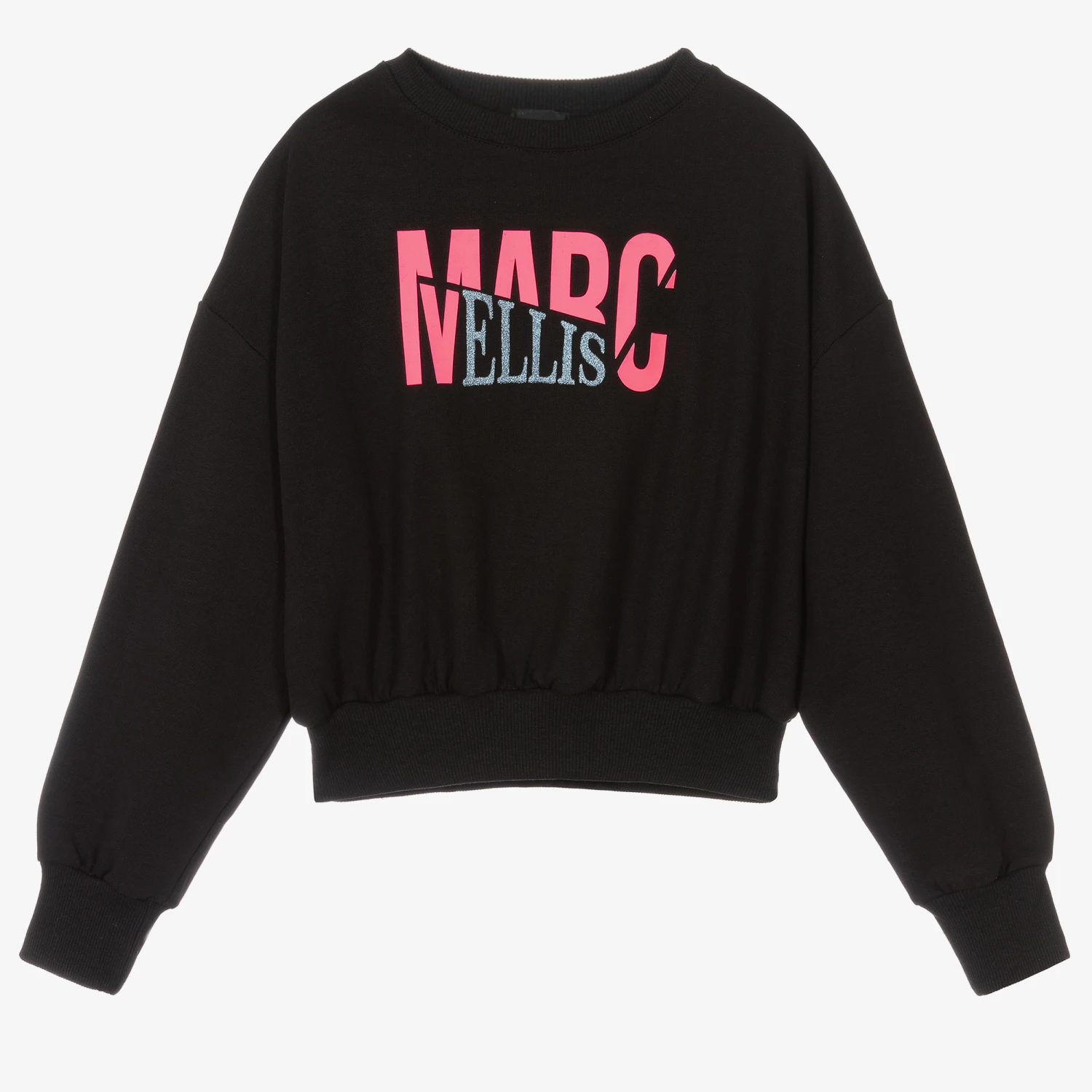 Girls black sweatshirt by American designer, Marc Ellis. Made in mid-weight cotton sweatshirt jersey, this casual top has designer credentials with dropped shoulders and a split neon pink and silver glitter logo on the front. The neckline, cuffs and hem are ribbed and stretchy.
