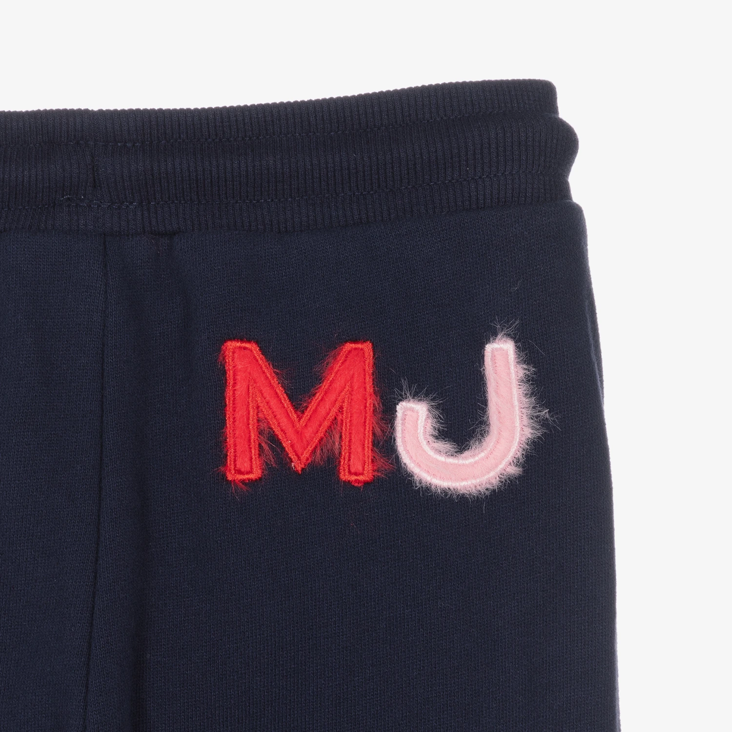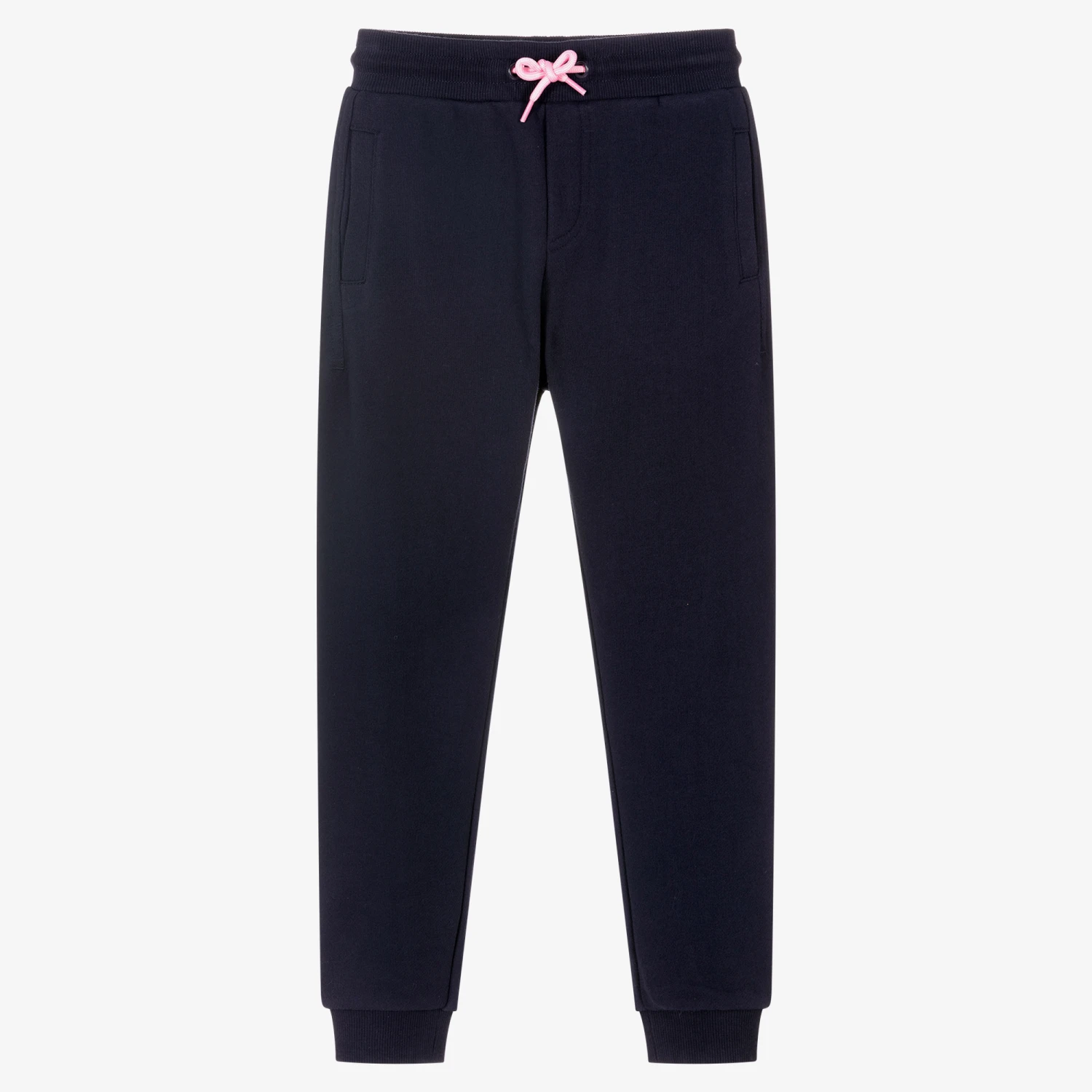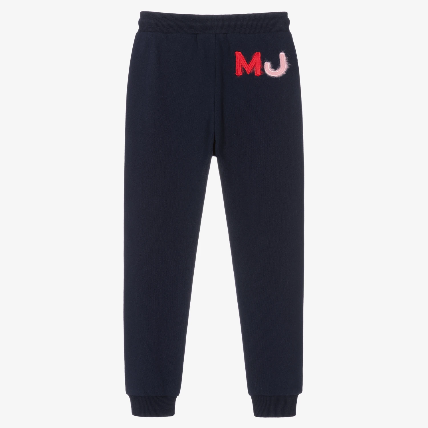 Girls comfortable navy blue joggers by MARC JACOBS, made in soft mid-weight sweatshirt jersey for warmth. There is a fun, fluffy faux fur embroidered MJ logo in pink and red on the back. The elasticated waist is easy to adjust with the bright pink drawstring and there are handy side pockets.