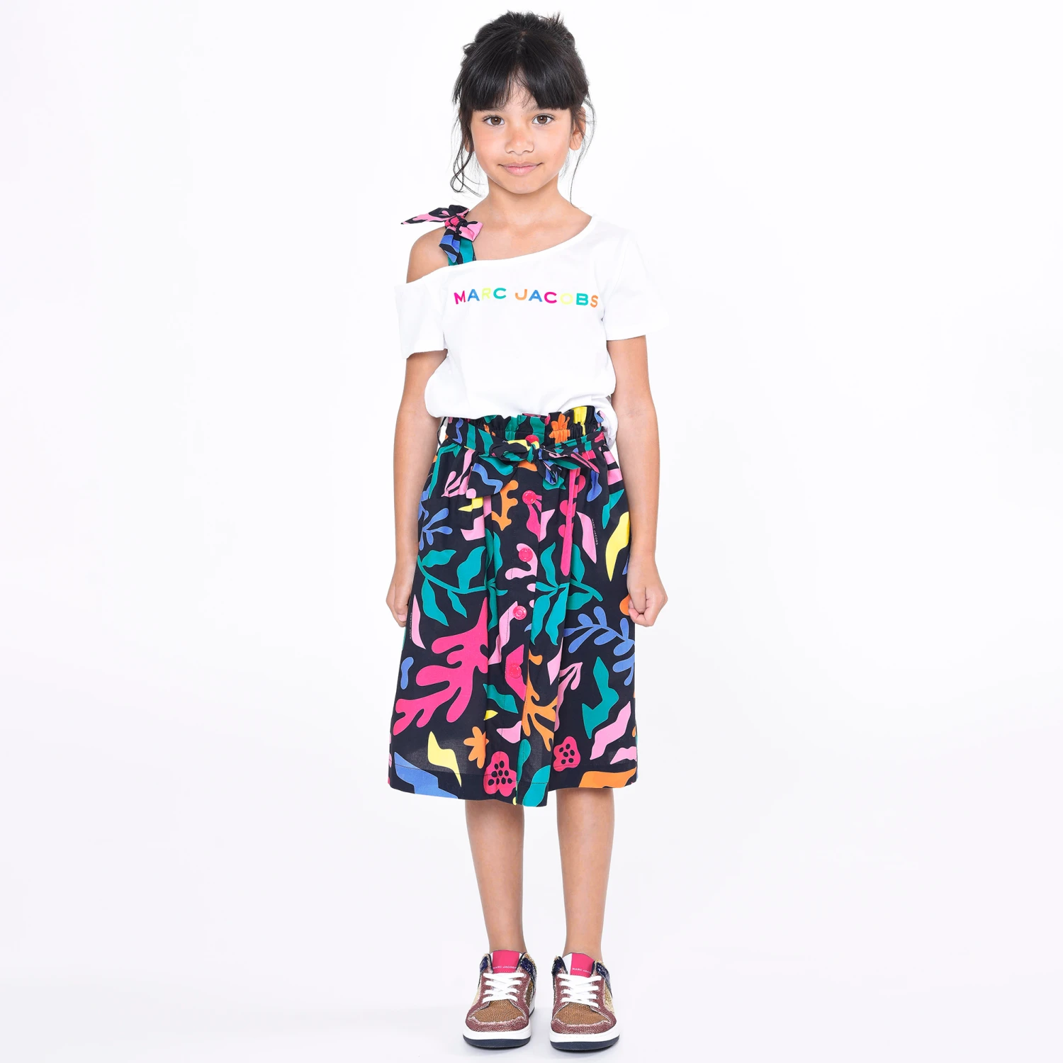 White T-shirt for girls by MARC JACOBS, made in soft cotton jersey. For an asymmetric look, it has a patterned strap on one shoulder in a pink, yellow and blue coral print. There is a fixed bow on the shoulder for a pretty touch. A colourful logo print across the chest completes this stylish, off-the-shoulder look.