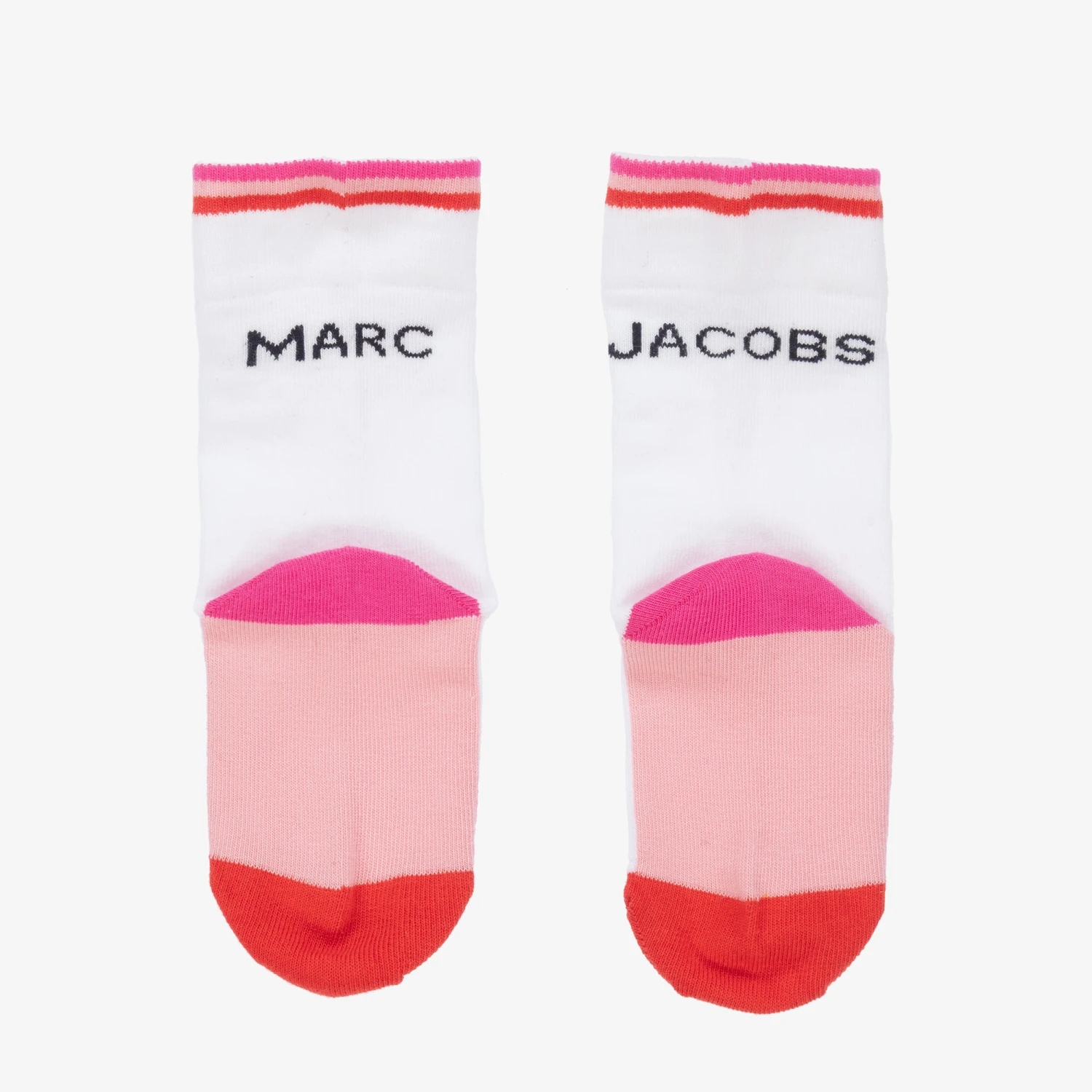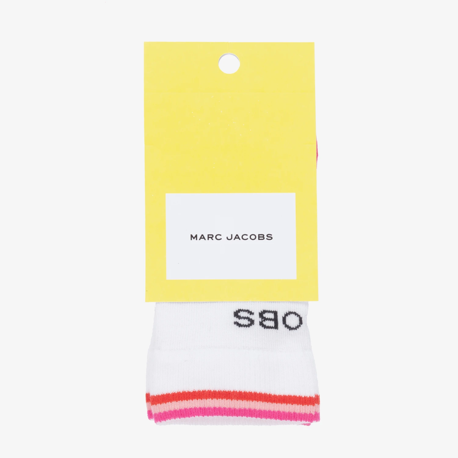 Girls white and pink cotton rich socks by MARC JACOBS. Soft and stretchy, they have black logo lettering on the back with orange and pink stripes on the cuffs.