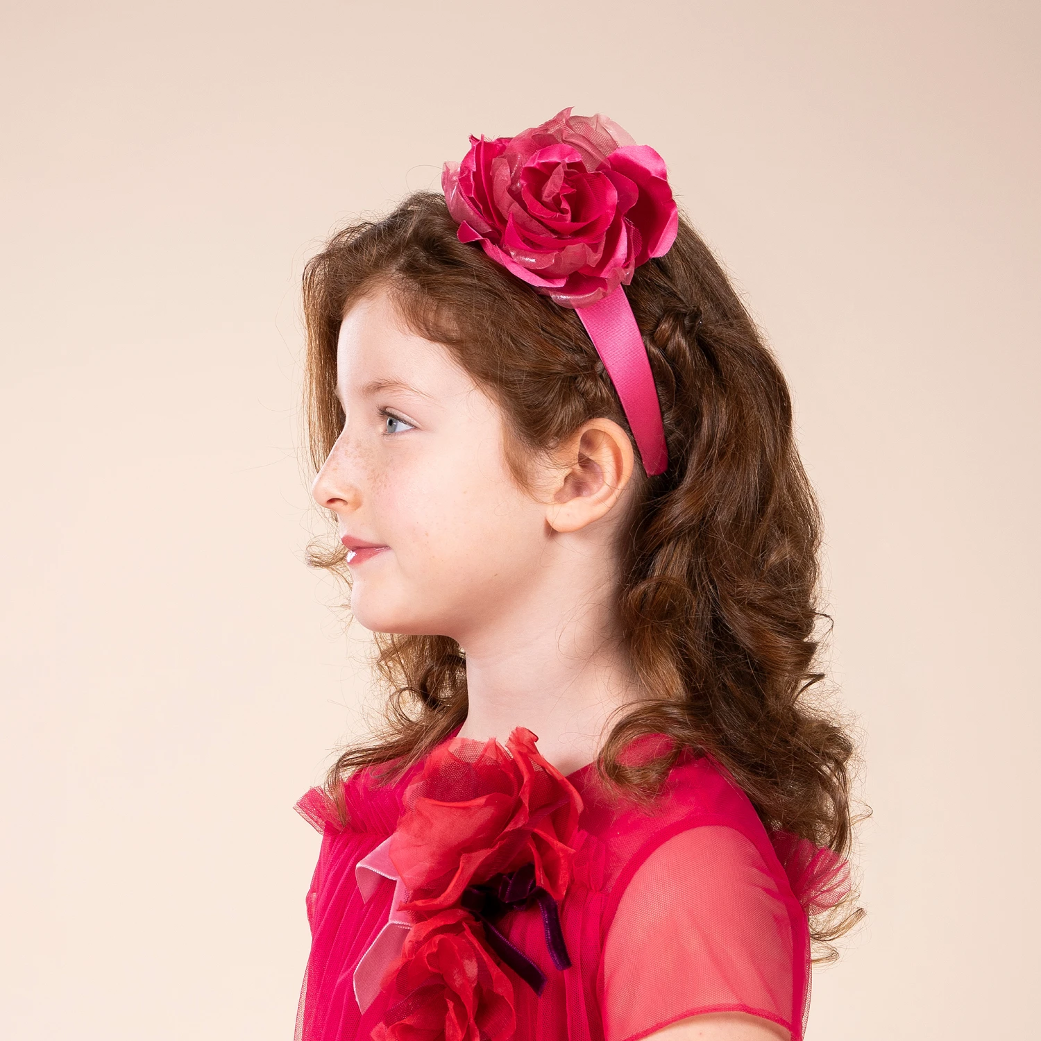 From Marchesa Kids Couture, fuchsia pink headband for girls. The flexible band sits comfortably on the head and is covered in smooth satin which is soft against delicate skin. The look is completed with a large satin and tulle flower on the side adding a touch of glamour to an outfit.