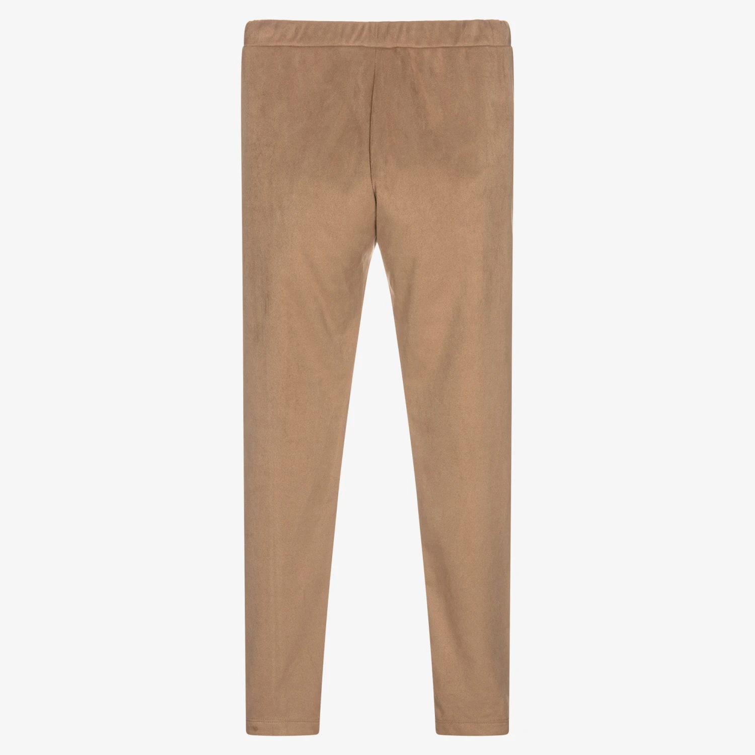 Dark beige leggings for girls by Mayoral, made in super soft faux suede jersey. Full length, they have a comfortable elasticated waistband and a stitched seam down the centre of the legs.