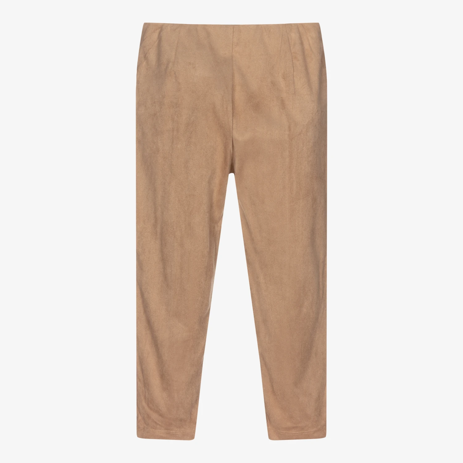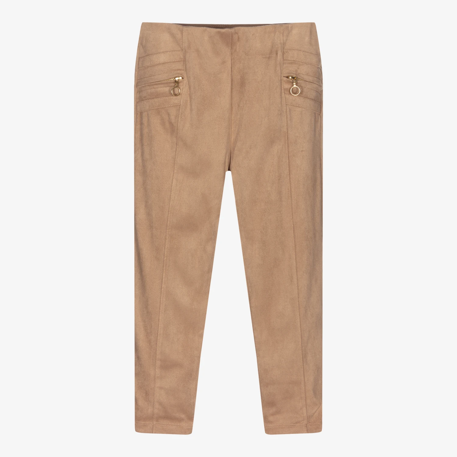Dark beige leggings for girls by Mayoral, made in soft faux suede. They have stitched seams on the front of the legs, with gold zip trims and a comfortable elasticated waistband.