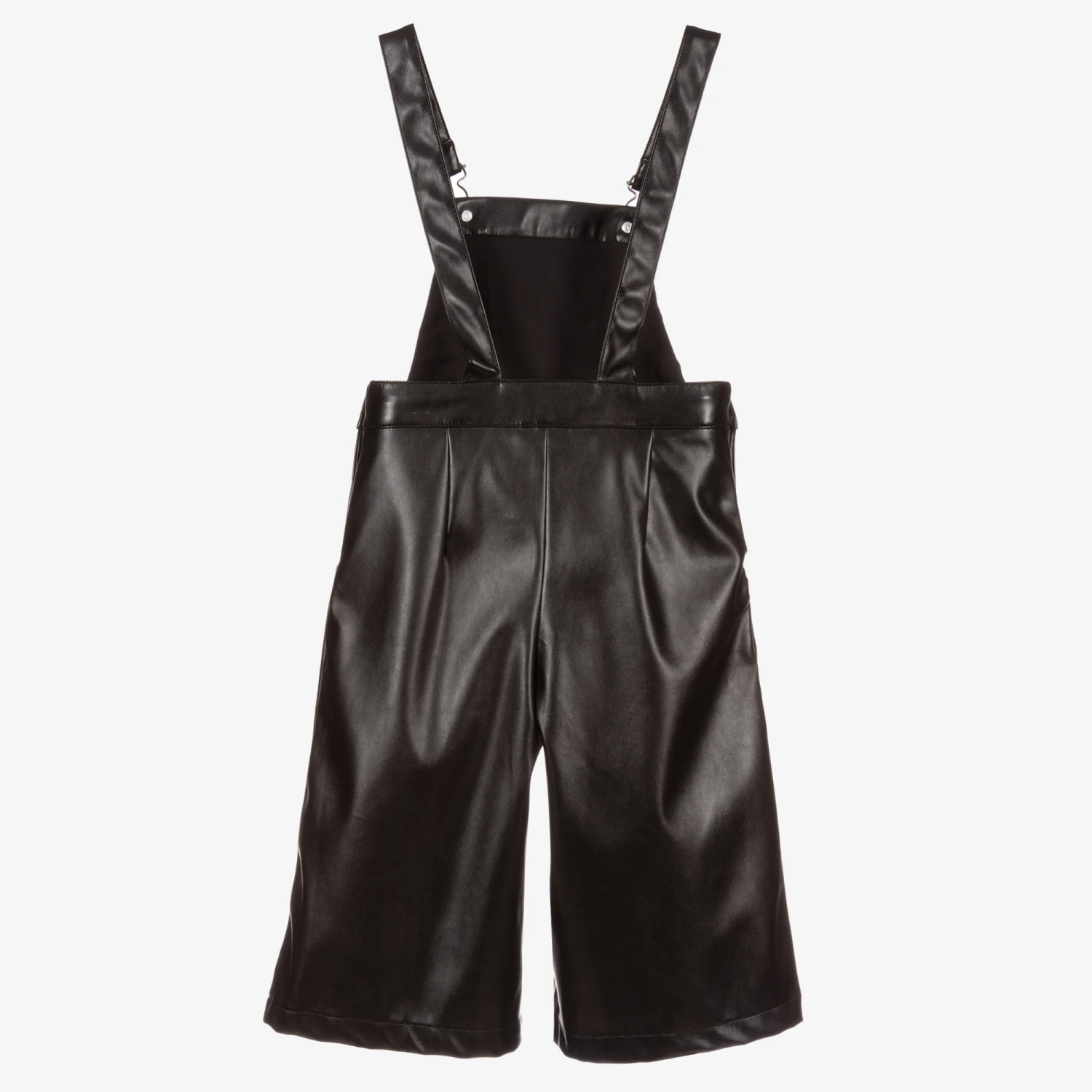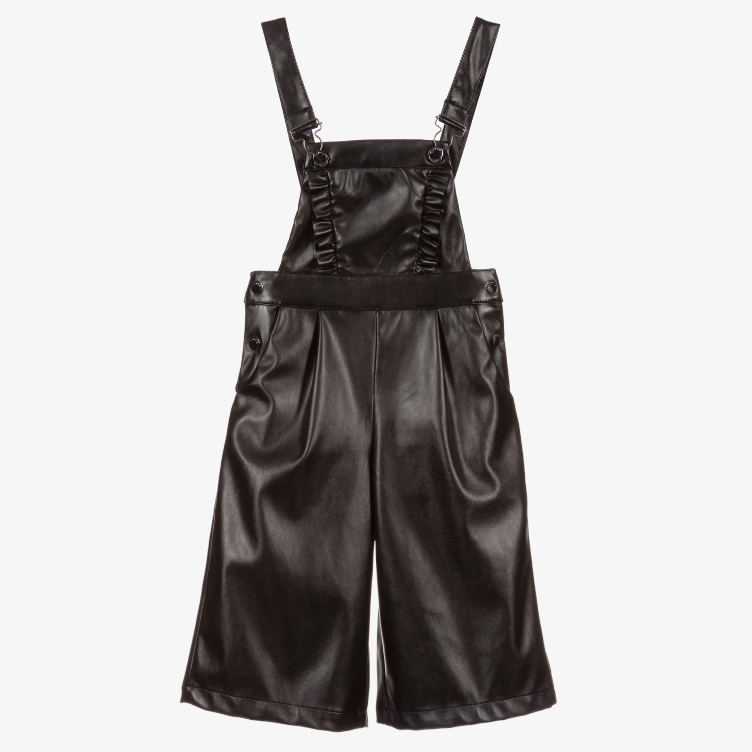 Black cropped, wide leg, dungarees for girls by Mayoral, made in soft faux leather. The bib has a cotton lining and ruffle trims. There are front pockets, side popper fastenings and metal clasp fastenings shoulder straps.