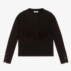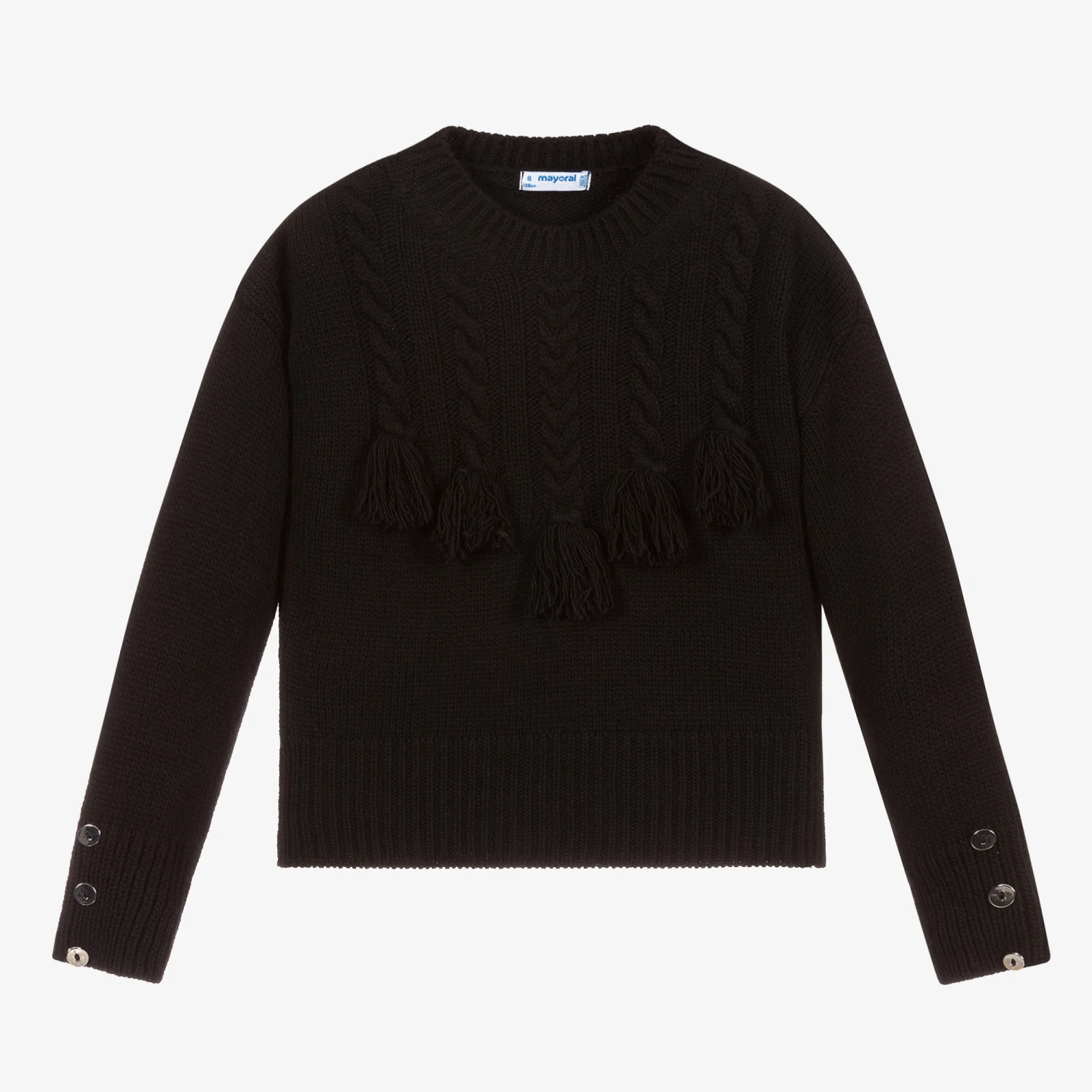 Black sweater for girls by Mayoral. Made in a soft wool blend, it has pretty cable knit detailing on the front with tassels and stylish silver buttons on the cuffs.