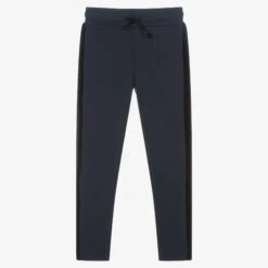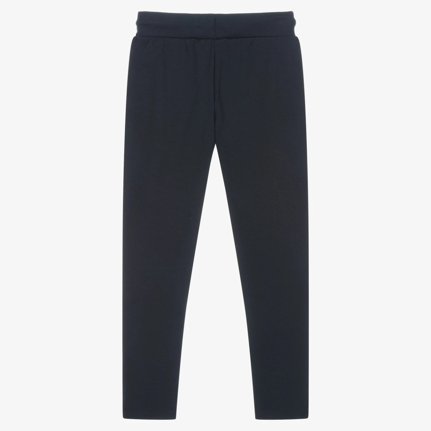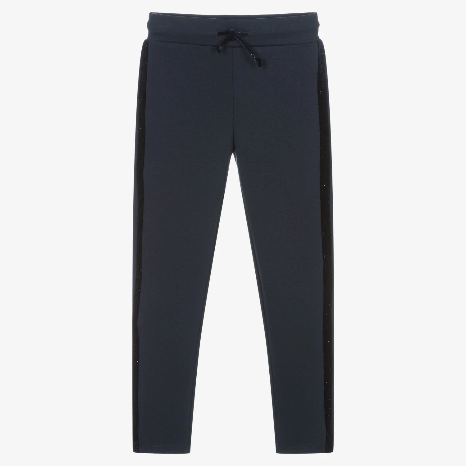 Smart casual navy blue trousers for girls by Mayoral, made in a soft viscose blend jersey. Slim fitting, they have glittery velour taping along the sides of the legs, and a matching drawstring for a good fit.