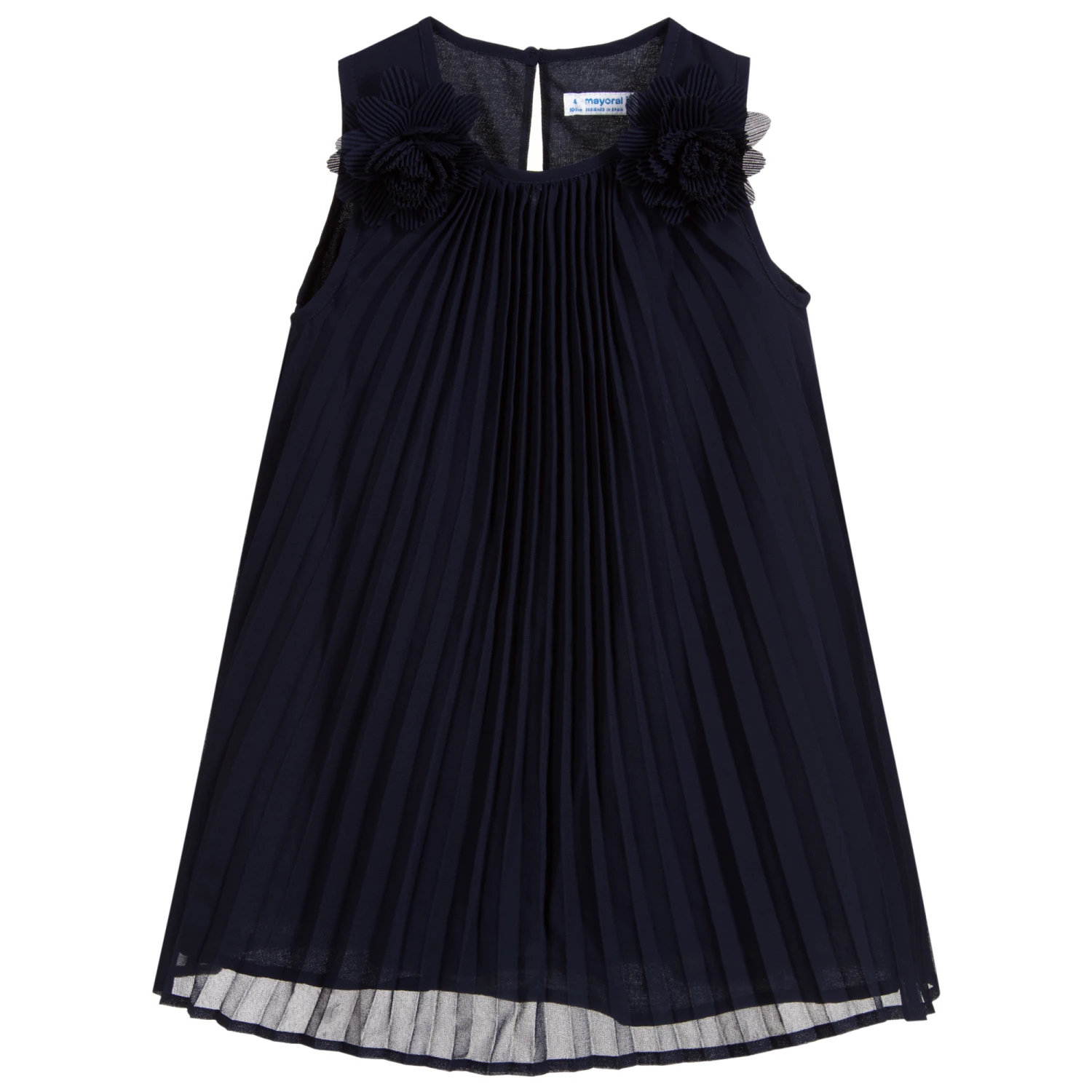 Girls navy blue pleated dress from Mayoral, made in soft chiffon. It is fully lined in lightweight polycotton, and has fabric flowers on the shoulders.