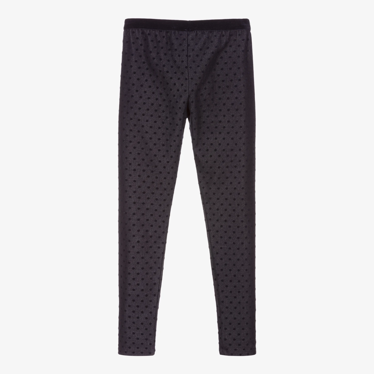 Navy blue leggings for girls by Mayoral, patterned with flocked navy blue polka dots. Full length, they are made in comfortable polycotton jersey and have a velvet-like, elasticated waistband.