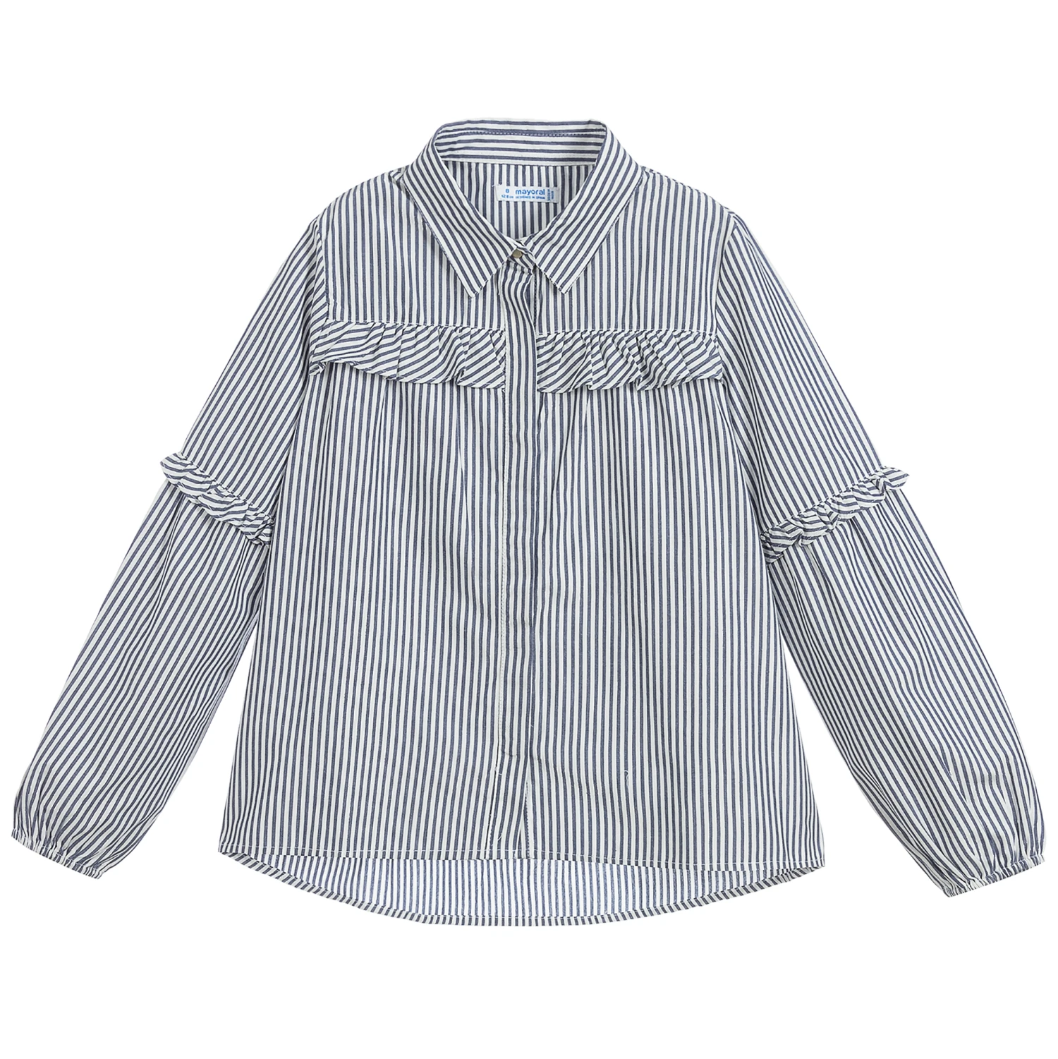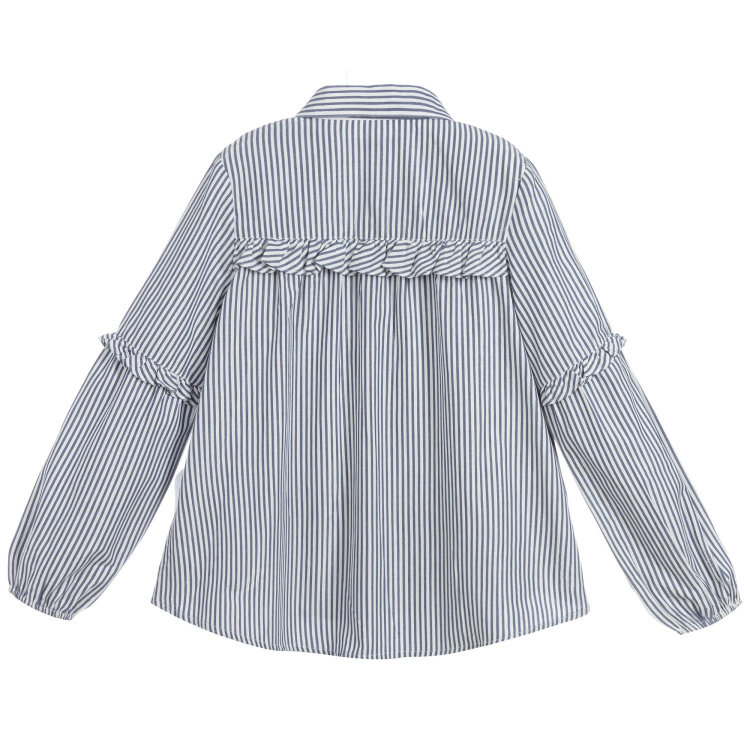 Girls blue and white striped blouse with a sparkly silver thread in the fabric by Mayoral. Loose fitting, it is made in soft cotton poplin with a ruffle trim on the front, back and sleeves. The button fastenings are concealed beneath a placket on the front.