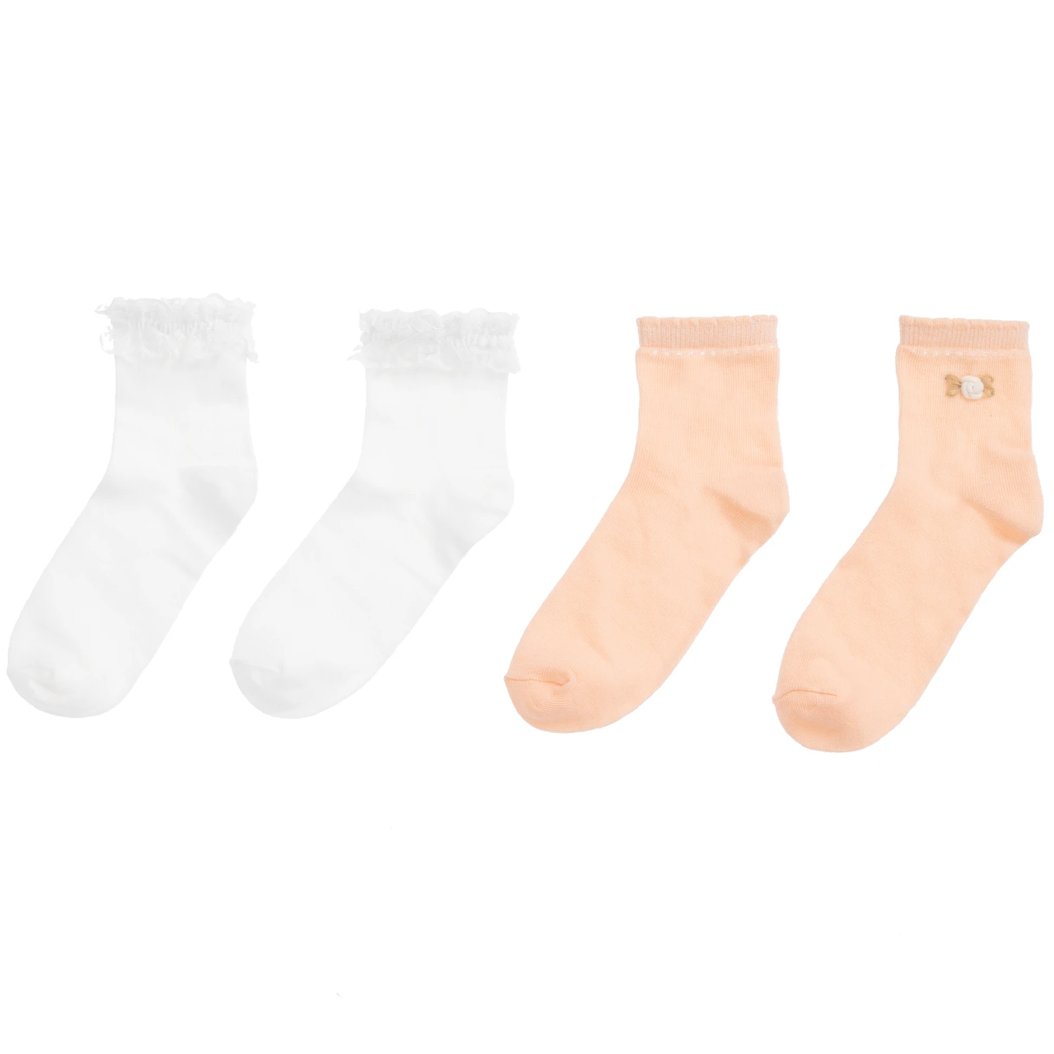 Two pairs of pink and white socks for girls by Mayoral, made in soft cotton. The white pair has pretty lace trim with a ribbon bow on the sides, and the pink pair has floral embroidery on the ankle.