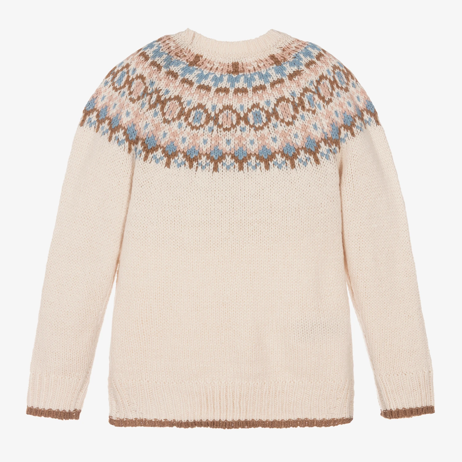 Lovely beige sweater for girls by Mayoral, with a pink, blue and brown Fair Isle pattern around the shoulders. It is made in a super soft acrylic blend and has ribbed trims.