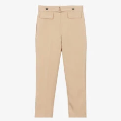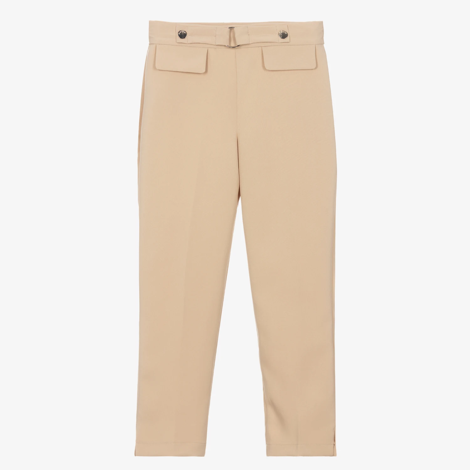 Smart beige trousers for girls by Mayoral. Silky smooth and lightweight, they have decorative branded studs and a metal ring detail on the front waist. There are faux pockets on the front and back, and they have on-trend split hems. For an elegant finish, they fasten with a concealed side zip and have a comfortable adjustable waist.