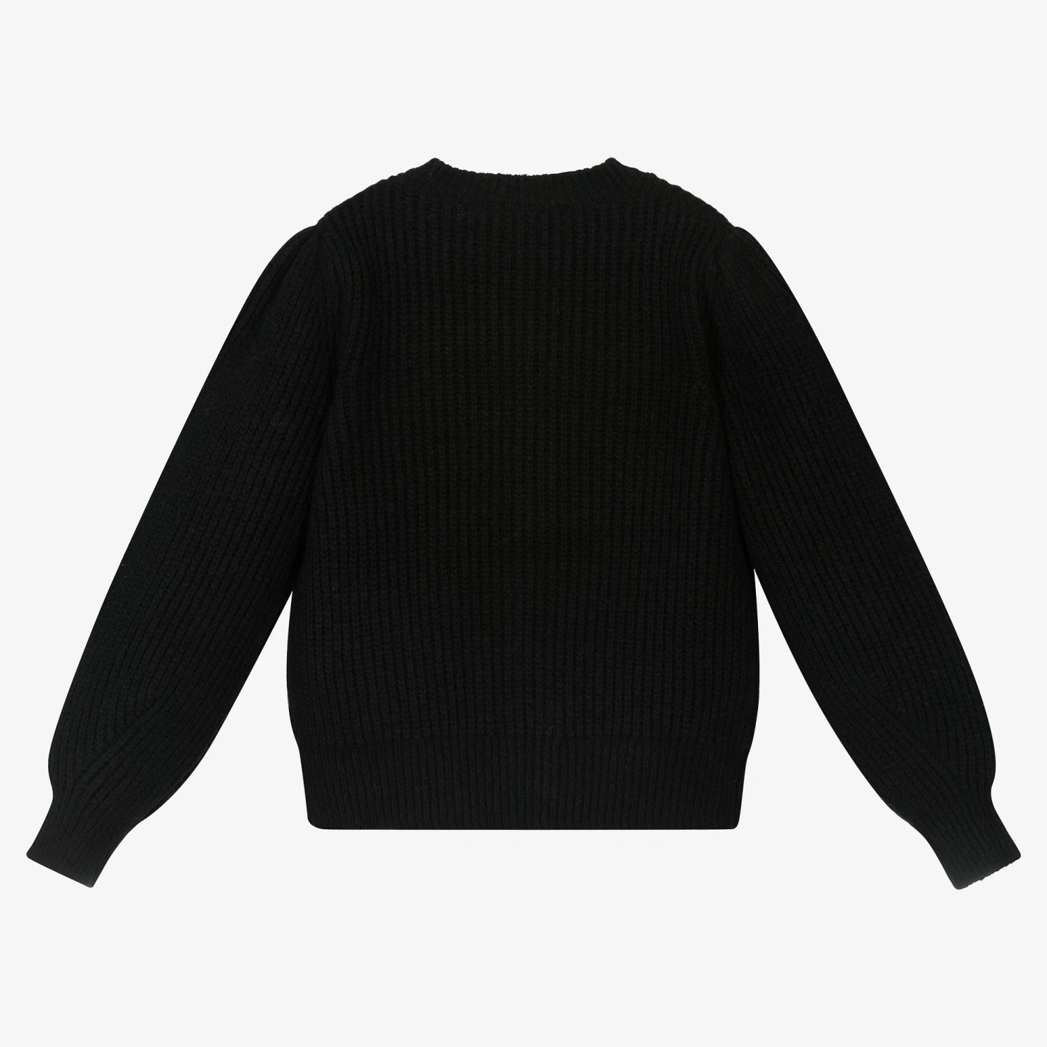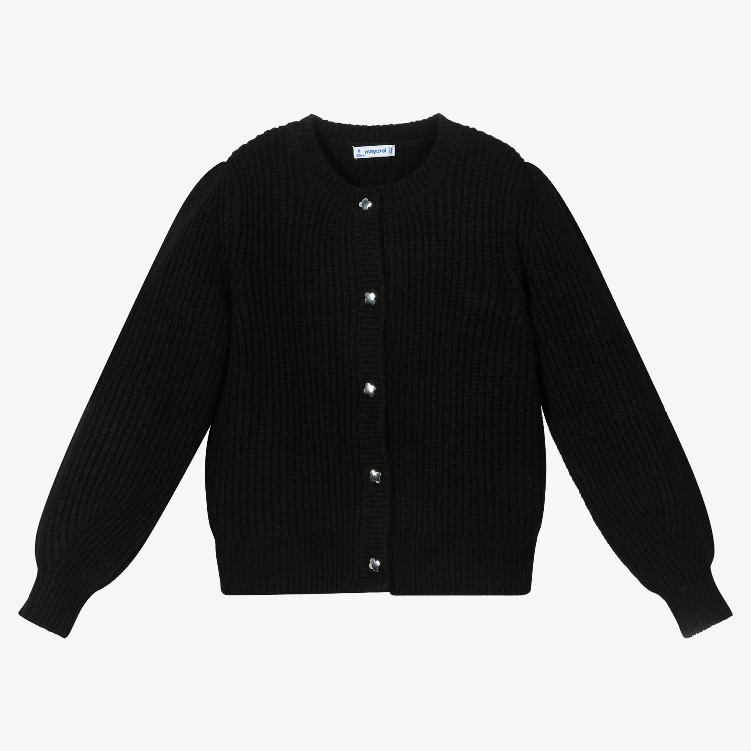 Black cardigan for girls by Mayoral, with shiny silver metal buttons. Made in a mid-weight, chunky, wool-blend knit, it has pretty puffed sleeves and ribbed trims for extra cosiness. This cardigan contains recycled fibres.