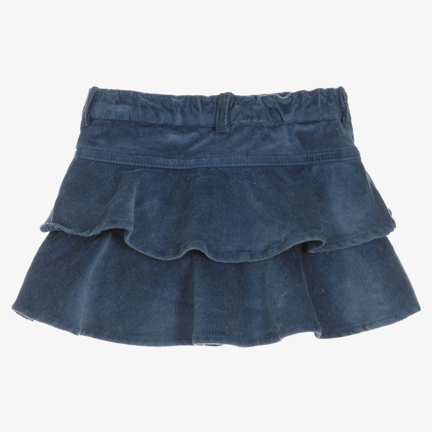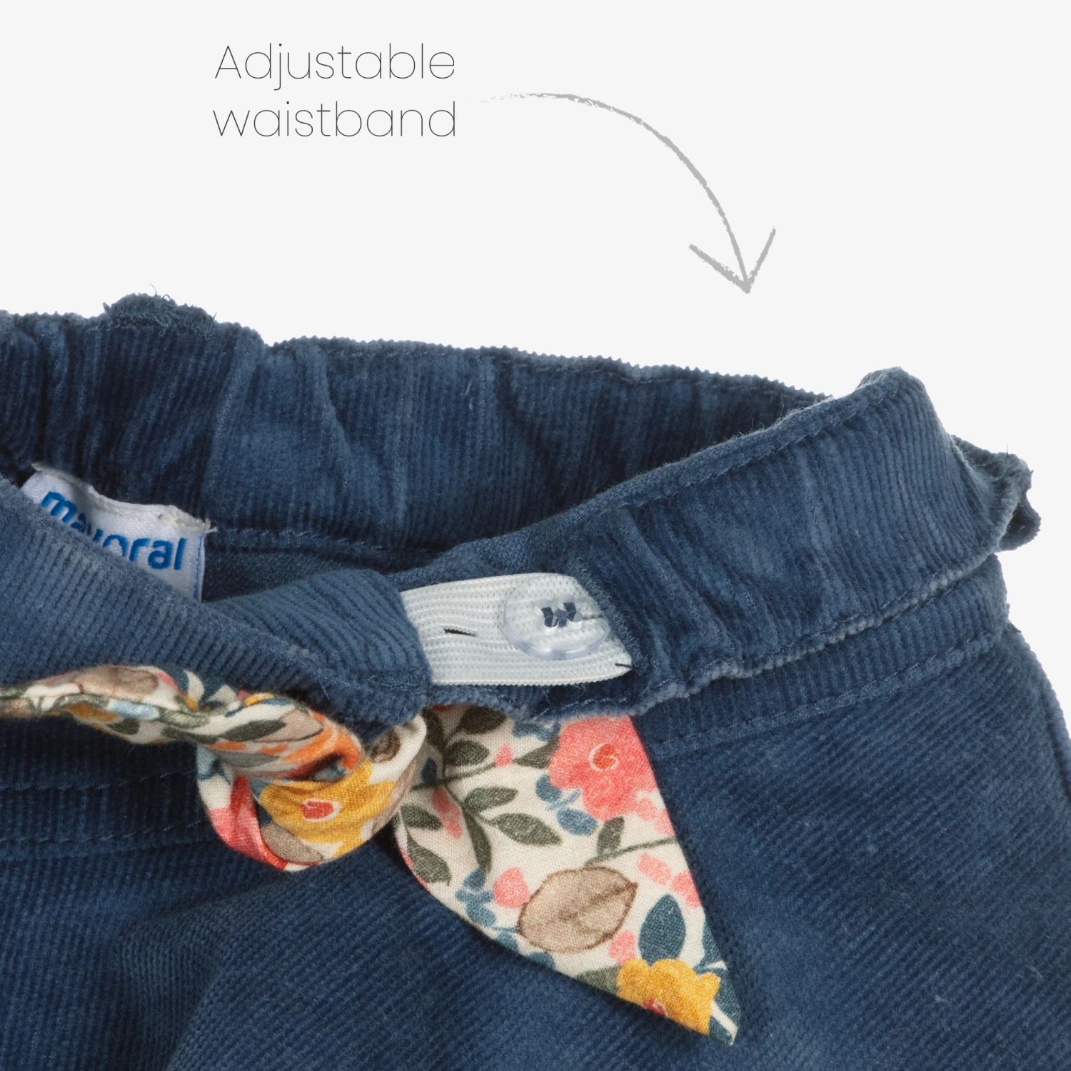 Gorgeous navy blue ruffle skirt for little girls, by Mayoral. Made in soft cotton corduroy, it has a sweet colourful floral tie-up bow on the waist, and a useful adjustable waist to alter as your little one grows.