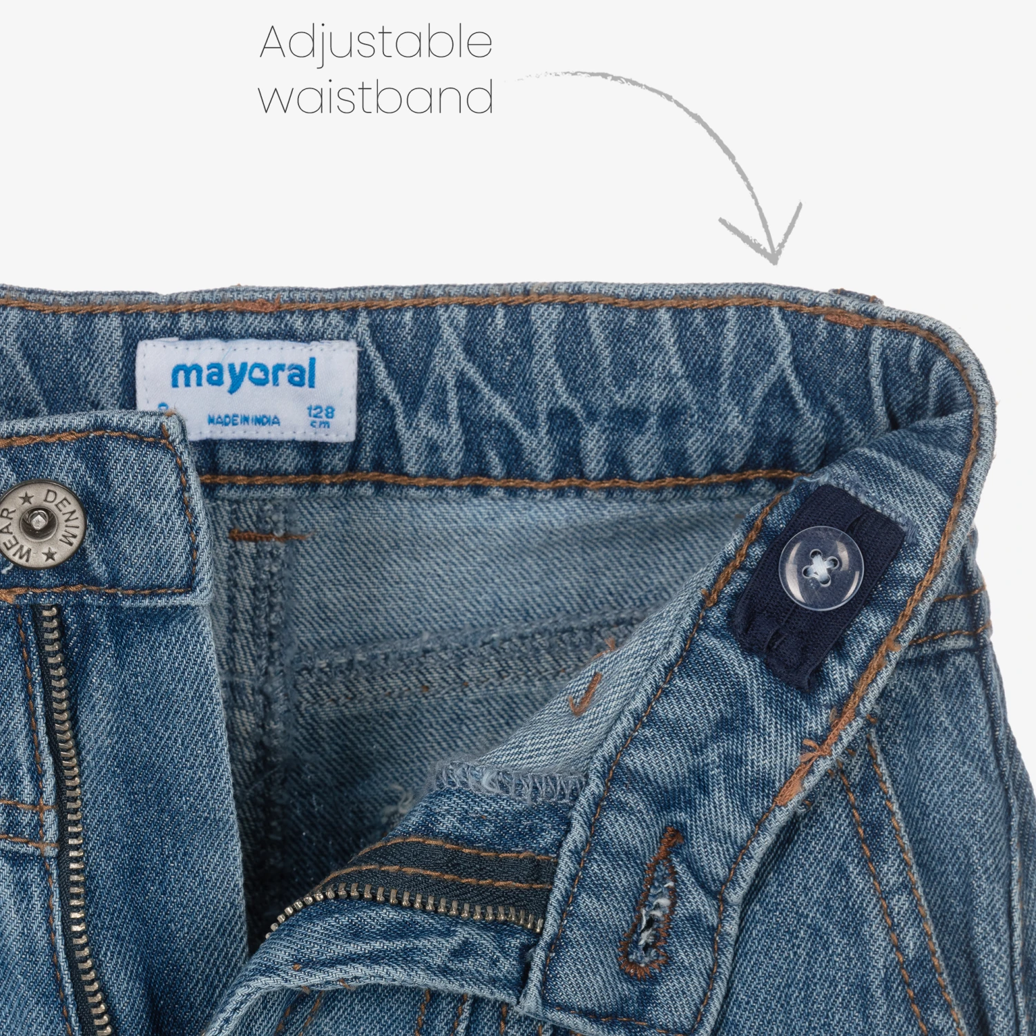 Blue slouchy fit denim jeans for girls by Spanish brand Mayoral, with front seam detail. An essential for any wardrobe, these high-waisted jeans are loose on the upper leg and taper at the ankle. They fasten with a button and zip on the front and are fitted with an internal adjustable waistband to get the ideal fit. Finished with front and back pockets, a shiny silver logo tab can be seen on the back of the waistband for a branded touch.
