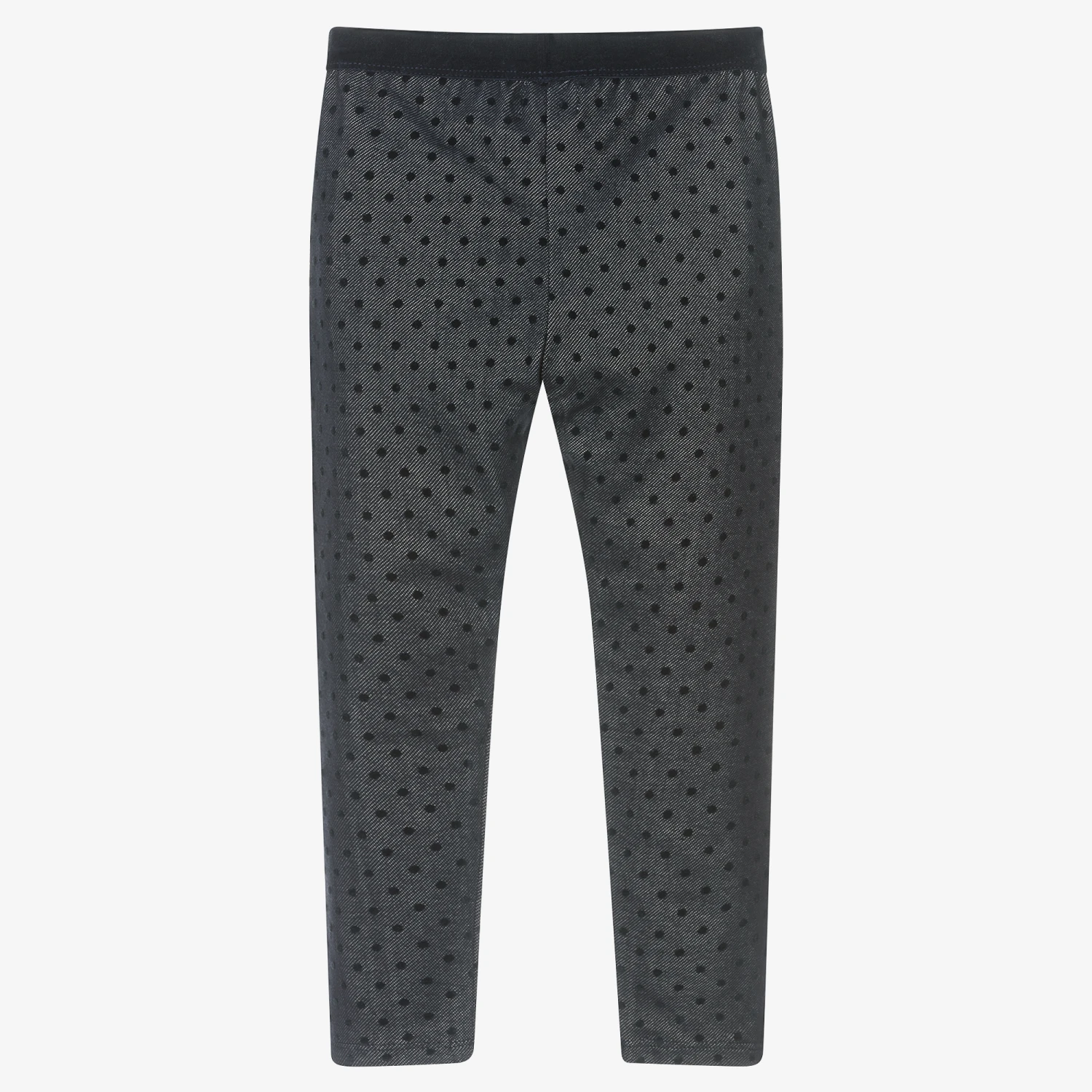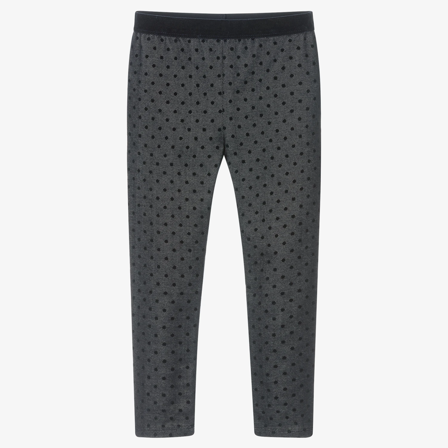 Cool and casual navy blue leggings for girls from Mayoral. Made in stretchy cotton blend jersey, they have velvet polka dots for a fun look and a matching velvet waistband.