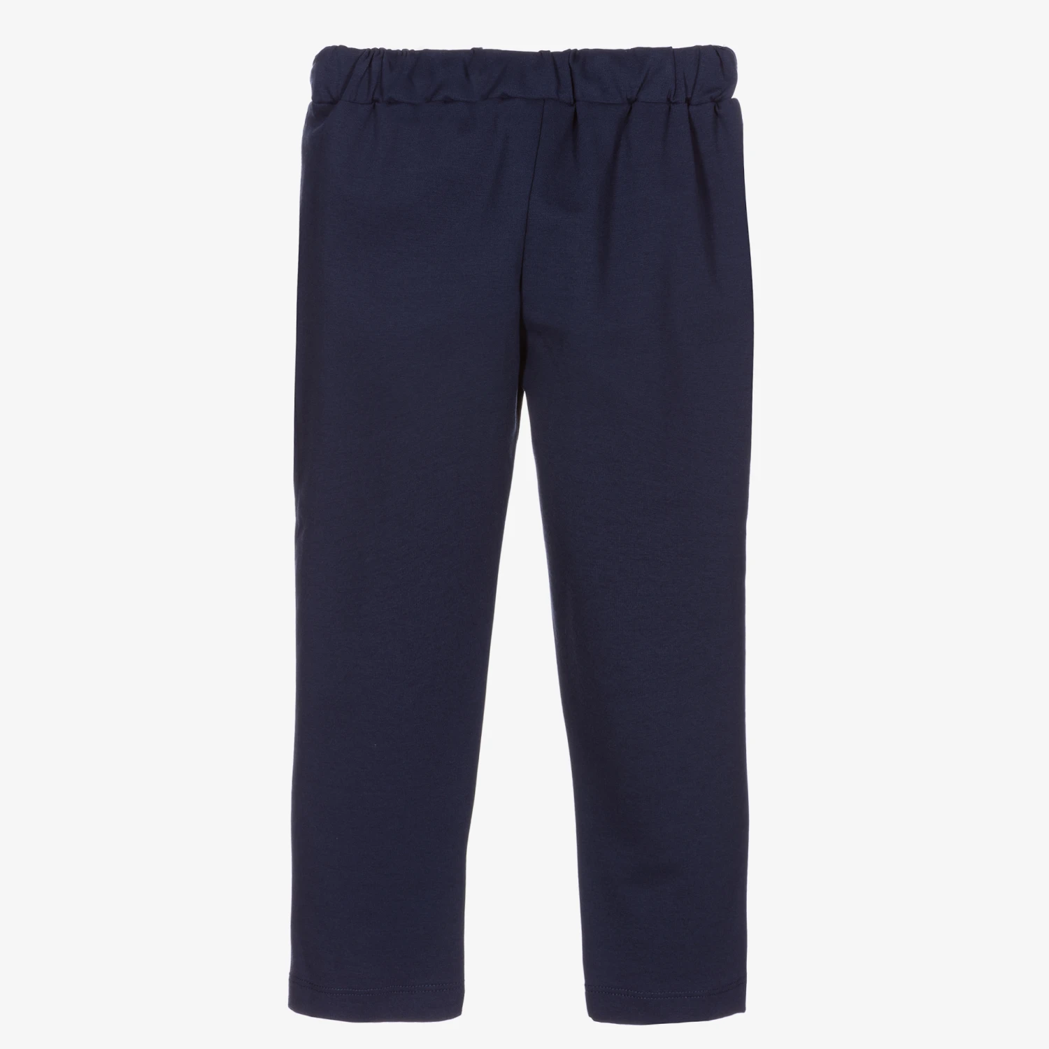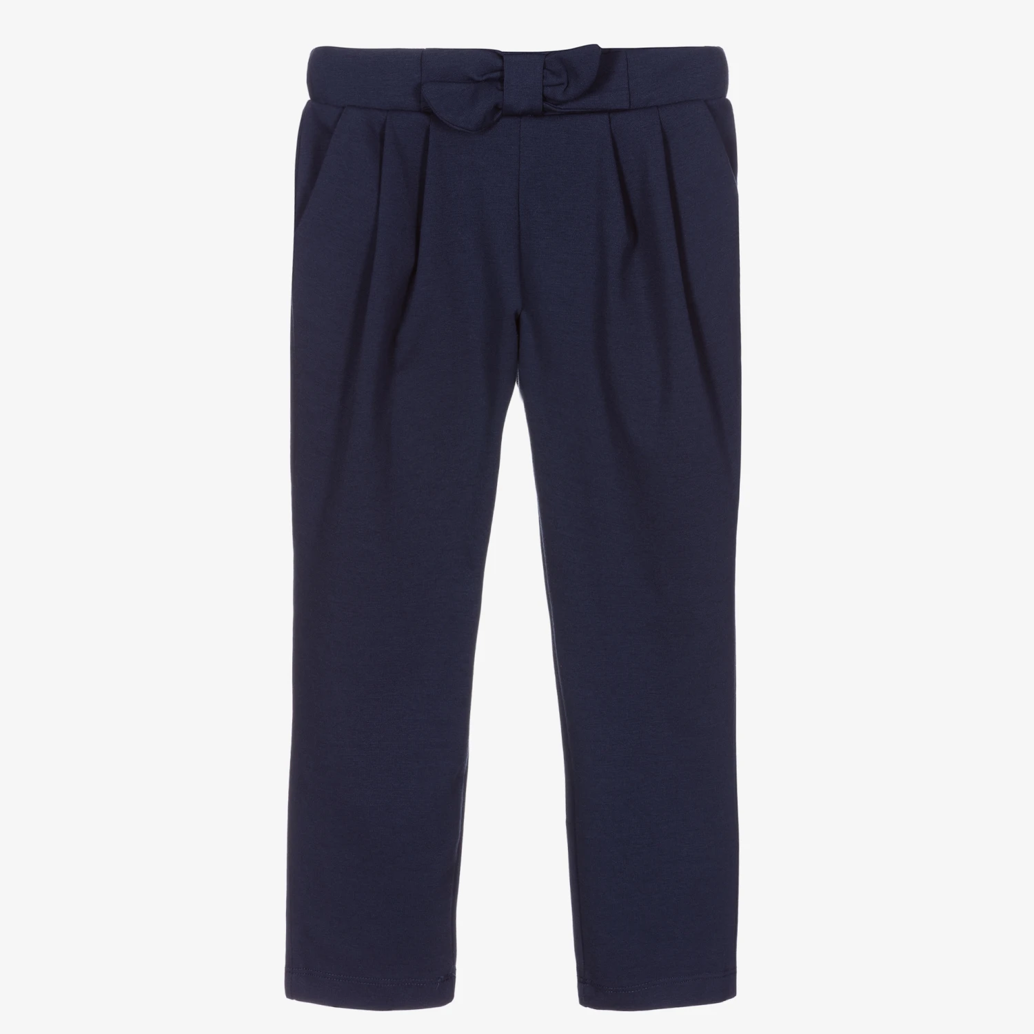 Navy blue trousers for girls by Mayoral, made in soft and stretchy cotton blend jersey. With useful front pockets, these tapered leg trousers are gathered in pleats near the waist to create a flattering, stylish silhouette. There is a smart bow detail on the front, and the adjustable waist is elasticated around the back for a comfortable fit.