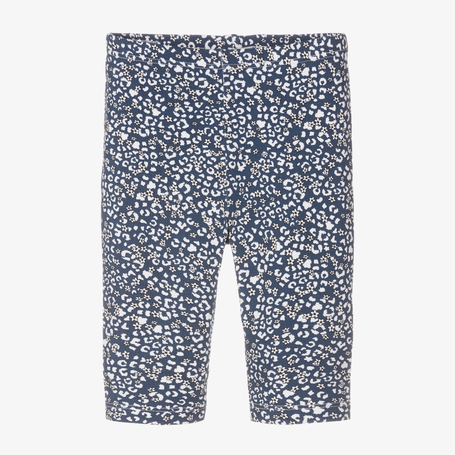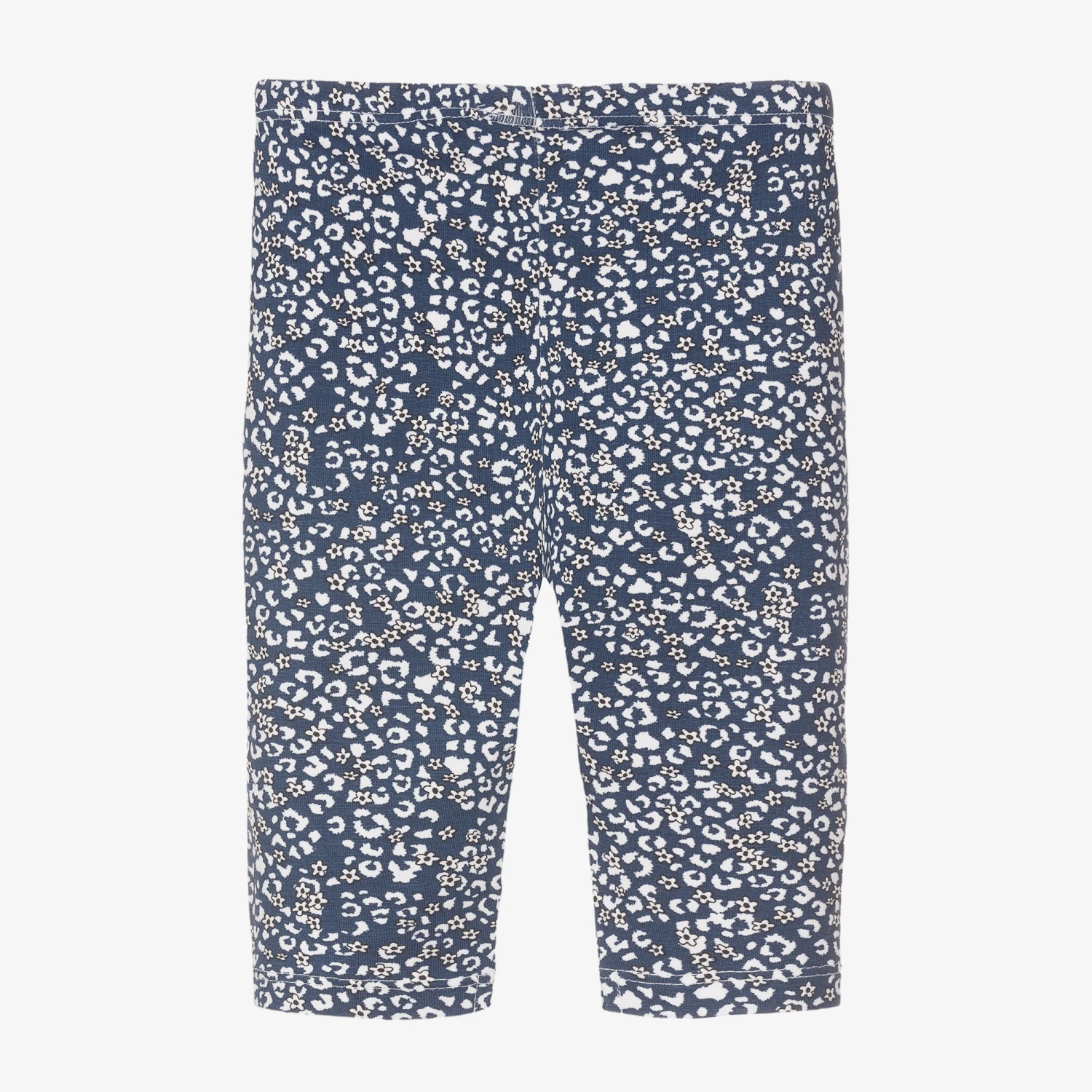Navy blue leggings for little girls by Spanish brand Mayoral, patterned in a playful floral leopard print. Made in soft and stretchy sustainable cotton jersey, they have an elasticated waist for comfort.