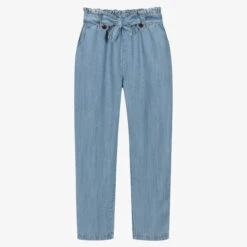 Navy blue chambray trousers for girls by Mayoral, made in super soft Tencelâ„¢ Lyocell with slanted front pockets. Designed in a relaxed fit, they have a comfortable elasticated waistband with a removable fabric tie, and belt loops with branded metal button fastenings.