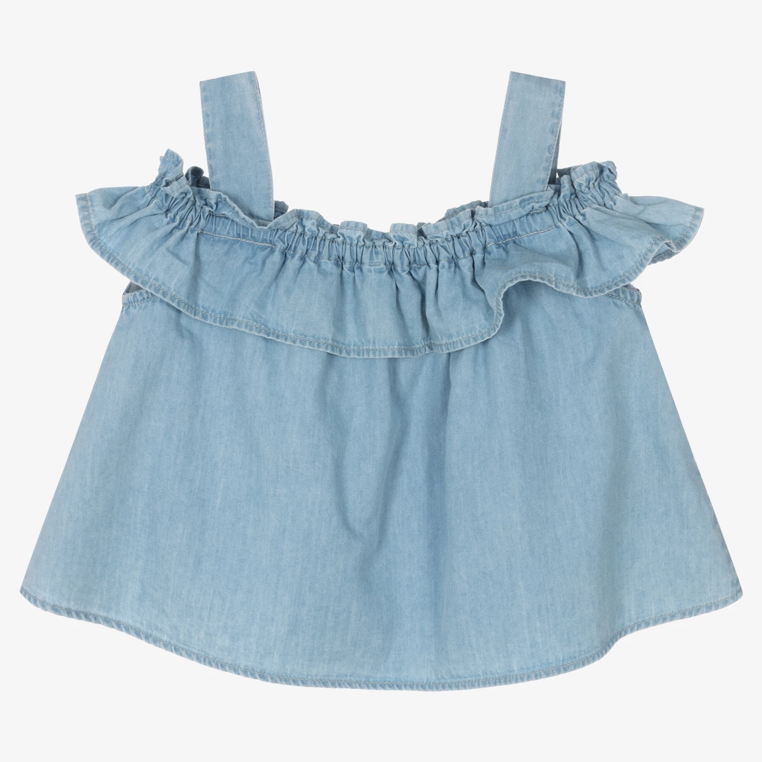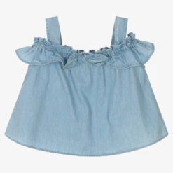 Blue blouse for girls by Spanish brand Mayoral, made in a soft, breathable cotton chambray. The stretchy elasticated neckline creates a comfortable, off-the-shoulder style, while the bow appliqué gives this top a girly feel.