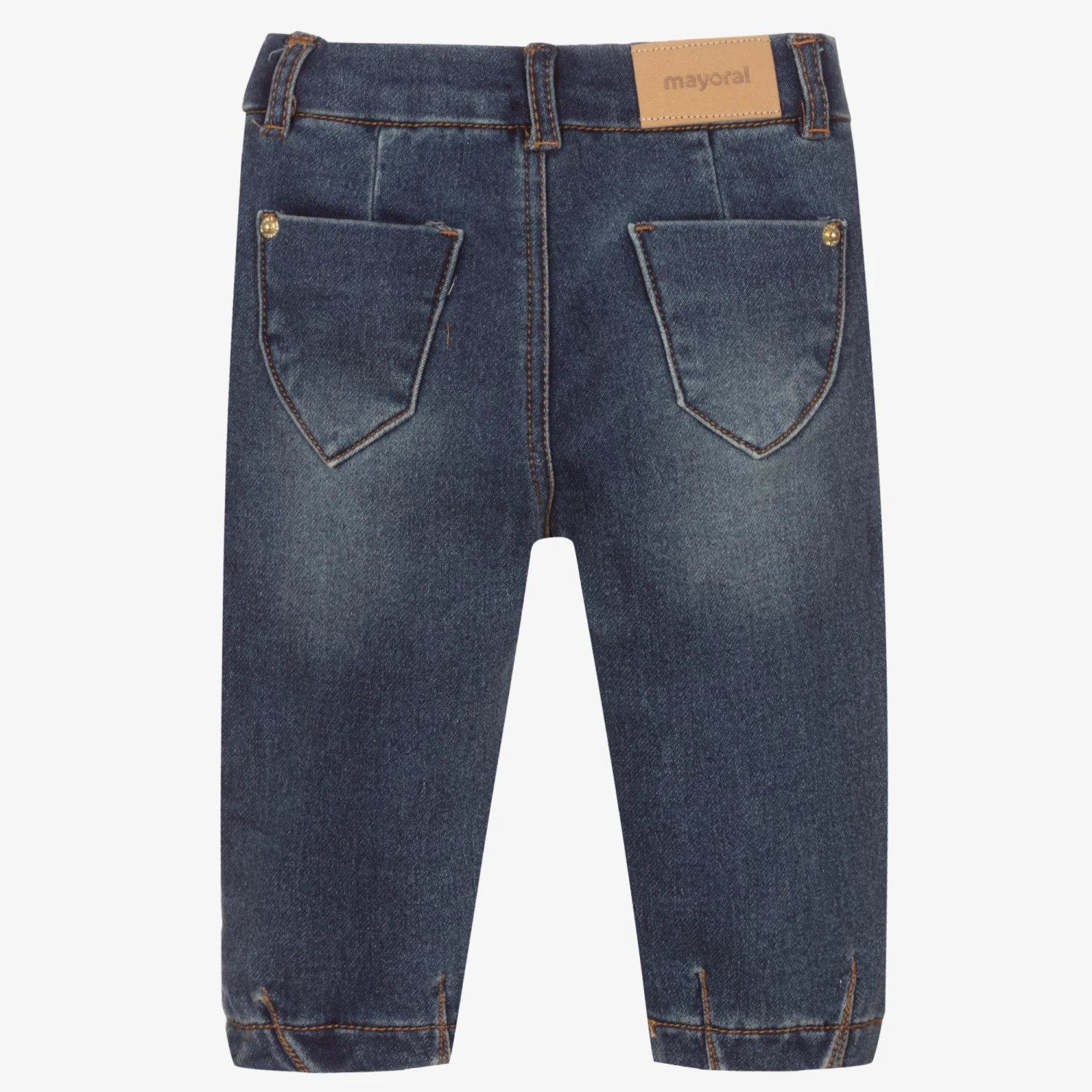 Little girls cute blue-washed slouchy trousers by Mayoral. With the look of denim and the comfort of soft cotton jersey, the front side has embroidered little yellow and beige tigers and dark blue paw prints. There are pockets on the front and back, belt loops and an adjustable waist.